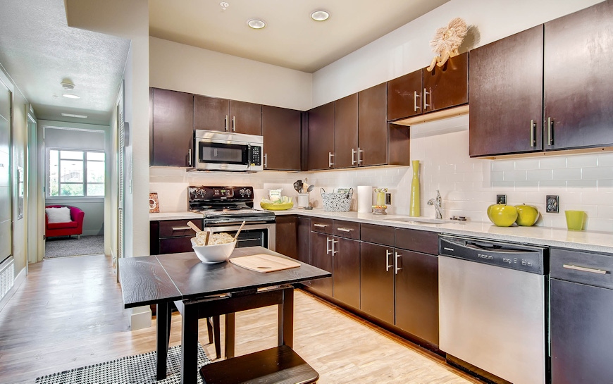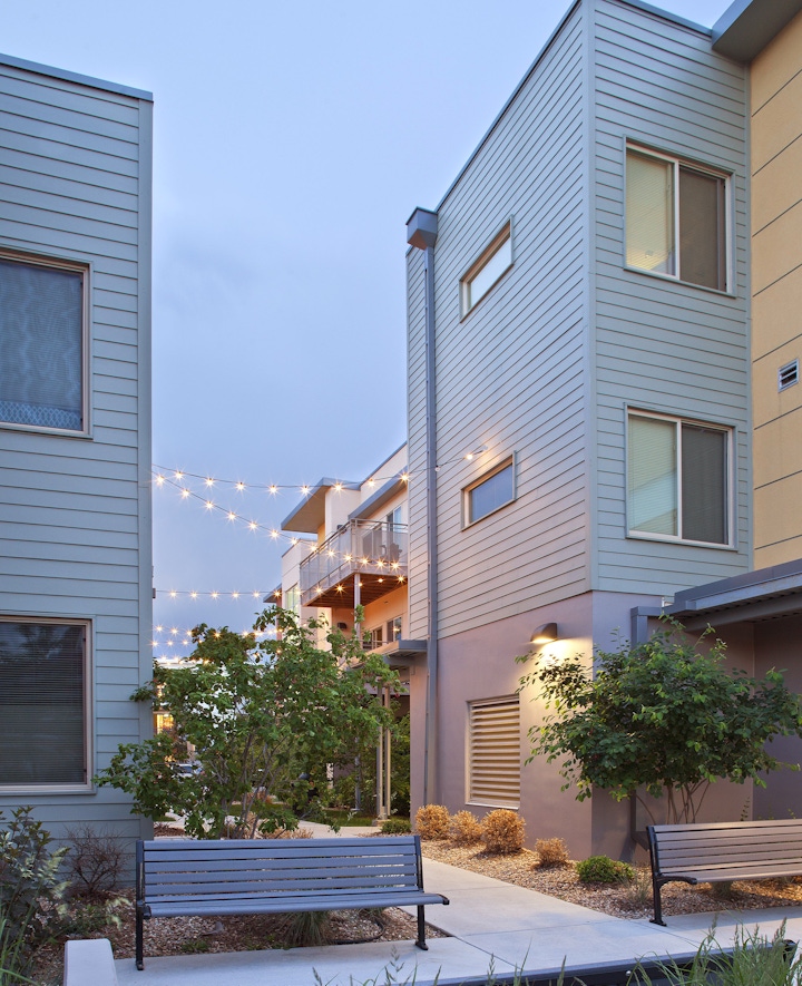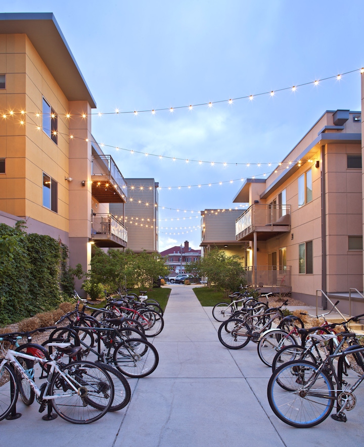 Acasia provides a unique off-campus housing experience for CU students, emphasizing amenities for each tenant and community spaces for engagement with their surroundings. Located directly across from campus, each unit has an exterior balcony to enhance its visual connection to the university and the surrounding foothills. Engaging the building with the exterior was a critical focus of the design. This was achieved through internal south-facing courtyards, with lush vegetation and overhead festoon lighting for evening gatherings. The “Paseo” between buildings offers more lush plantings, vegetative screen walls, and festoon lights. Each student’s needs for a comfortable living environment are met with a private bathroom off every bedroom and an open central living space with an exterior balcony. The recreational lounge and fitness room adjacent to the main lobby promote student connectivity. It flows seamlessly into the lobby, which energizes the space as a social hub for the tenants.