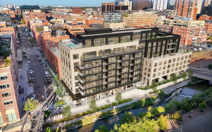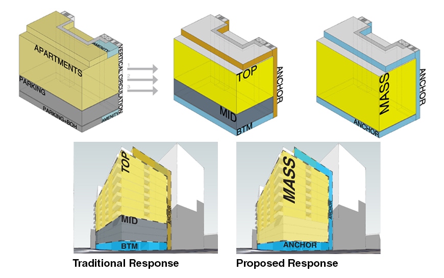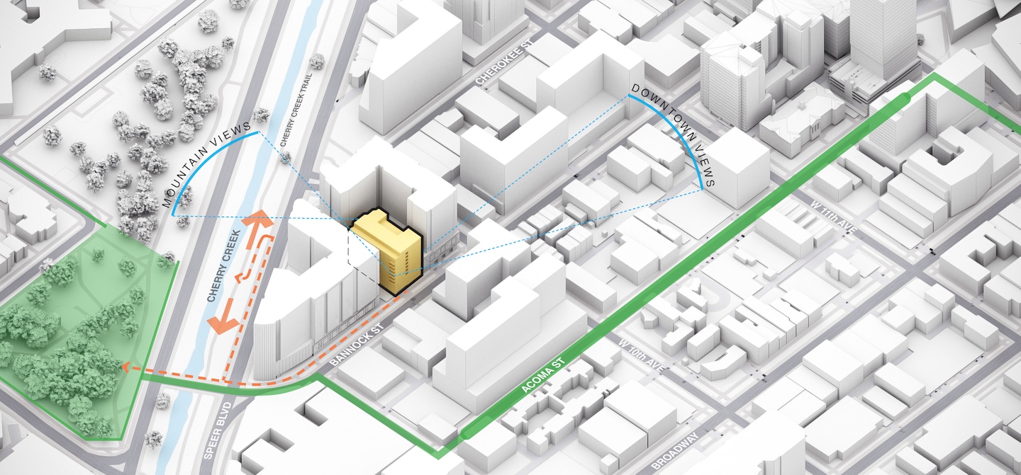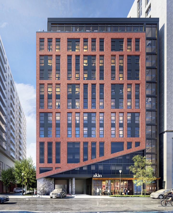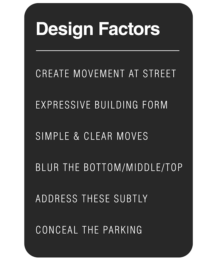 Inspired by a desire to create a pause in the architectural landscape, akin Golden Triangle cleverly stitches together programmatic uses and functions of the building with a cohesive exterior. By visually connecting the buildings to the south and soon to the north, movement is generated, and unique character is revealed. Utilizing traditionally more rigid and heavier material, brick delicately drapes the building’s mass while also being anchored by a transparent base, spine and top. An intricately patterned ‘veil’ honors the design guidelines of the Golden Triangle neighborhood, while taking a new angle to the built form of the Arts District.