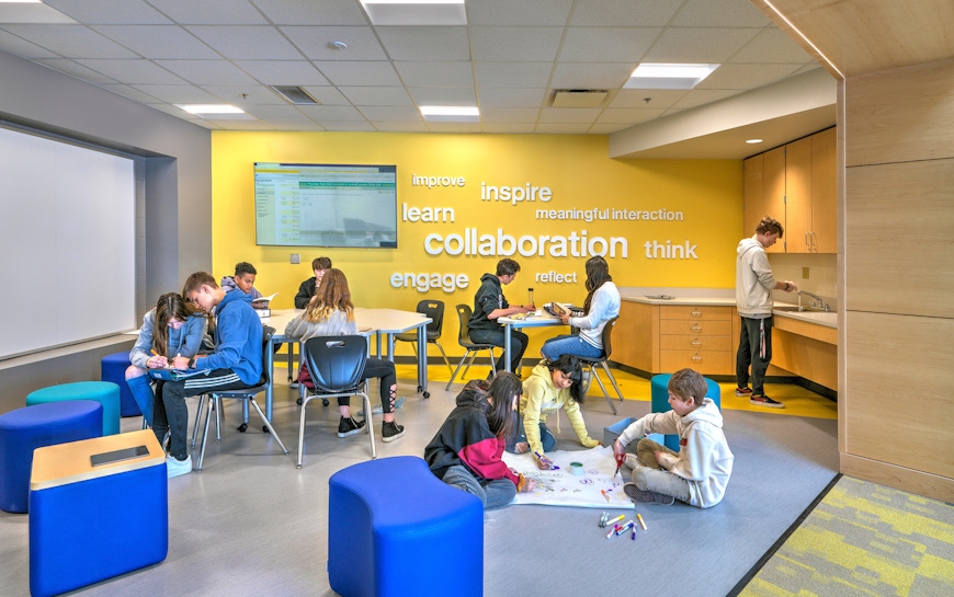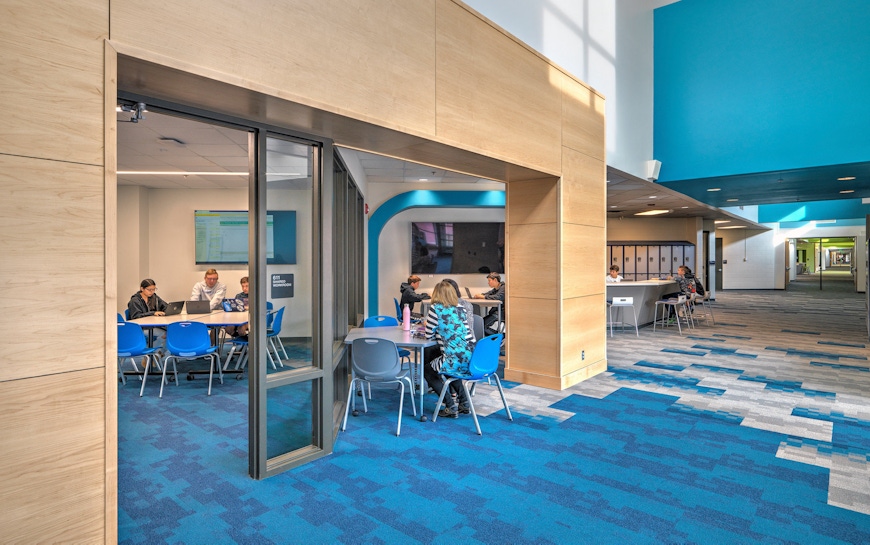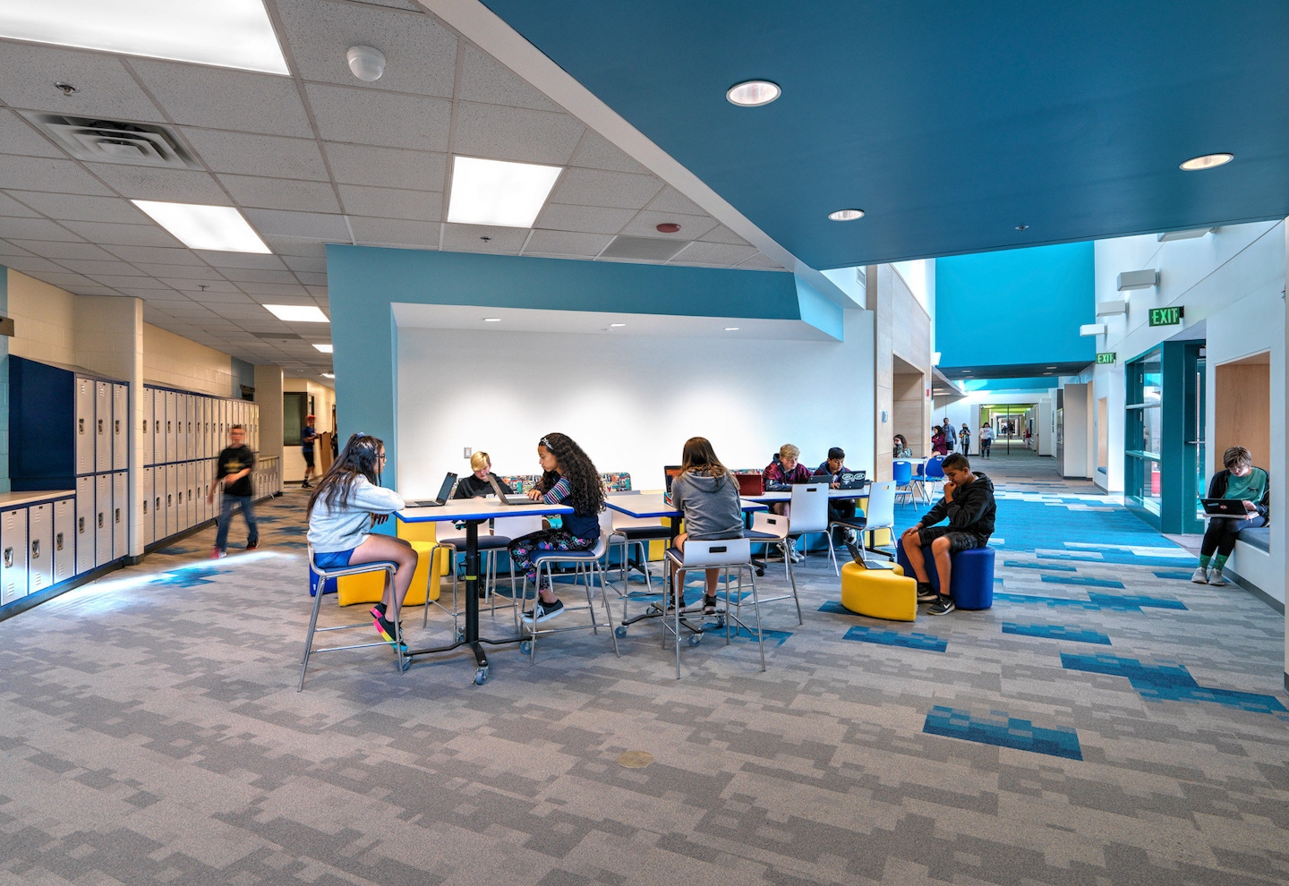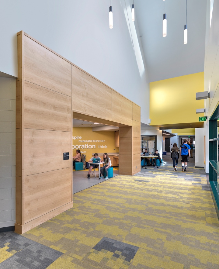 Boulder Valley School District had two parallel projects–first, to remodel the school, and second to create the spaces that support innovation in education. OZ immediately recognized the value in combining the two projects, both budget and scope, and the school was able to update their image and reposition the learning environments. The school’s highly visible corridors were updated to a more mature and relevant finish scheme. The learning environments were enhanced by creating a variety of spaces allowing for presentations, small group innovations, project explorations, and focused individual learning. Additionally, the broken partitions were replaced with hard walls or new acoustical glass operable partitions, ensuring teachers have the choice between a standard classroom for traditional instruction or a connected pair of rooms that allow for team teaching.
