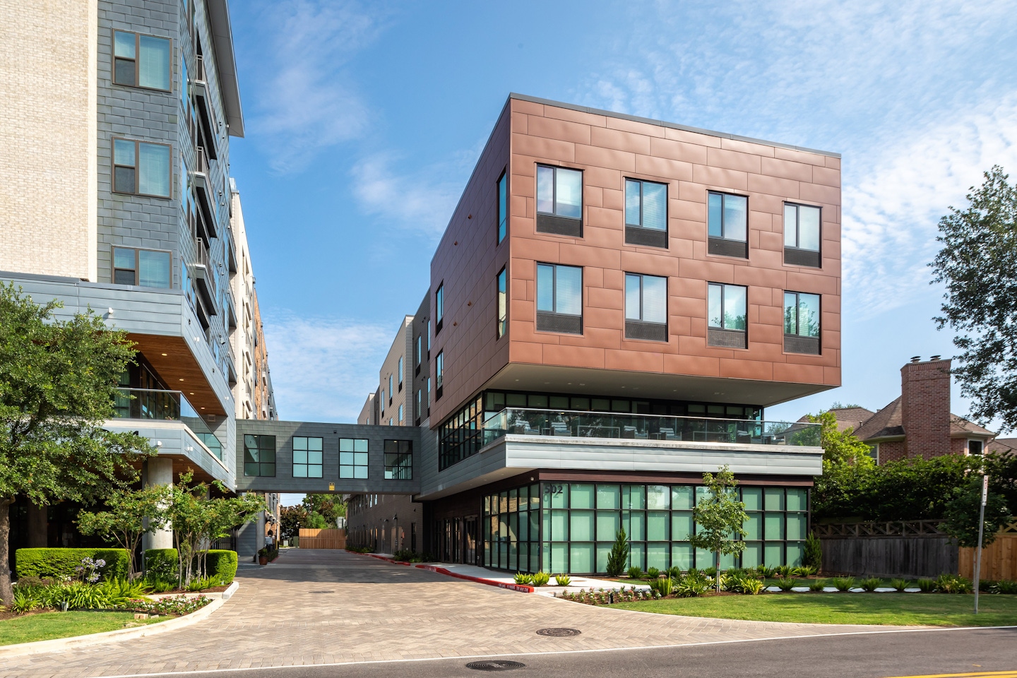 Anthology of Tanglewood is a unique and multi-faceted endeavor. The 7-story renovation transformed an underutilized apartment building into a vibrant independent living community. A new 4-story memory care and assisted living building rounds out this older adult campus. This historic neighborhood brought with it a complicated site; due to its narrow footprint, the lot was deemed to be undevelopable. Site access and connection to shared amenities and support spaces presented multiple design challenges. A solution was a glass sky-bridge from the existing building to the new addition, providing a connection to shared common areas between buildings and reducing the need for additional support spaces. Amenities that encourage social gatherings include a poolside bar & bistro, spacious dining venues with expansive terraces, fire-side lounges adjacent to a bustling café, and a multi-purpose room utilized for creative pursuits. Spaces that promote wellness include a therapy and exam suite for visiting home health providers, a salon and barbershop, and fitness rooms.