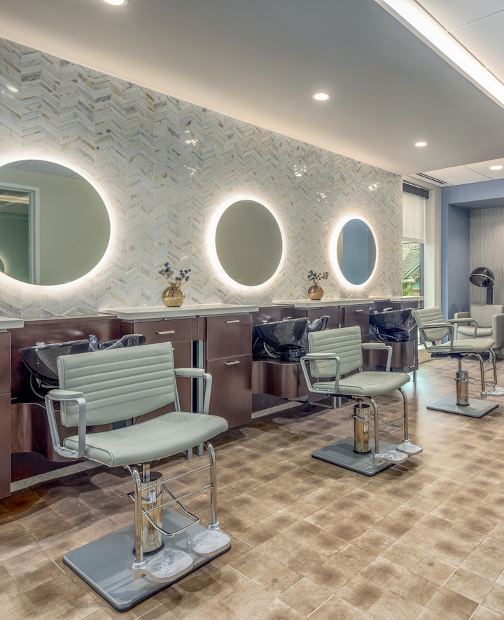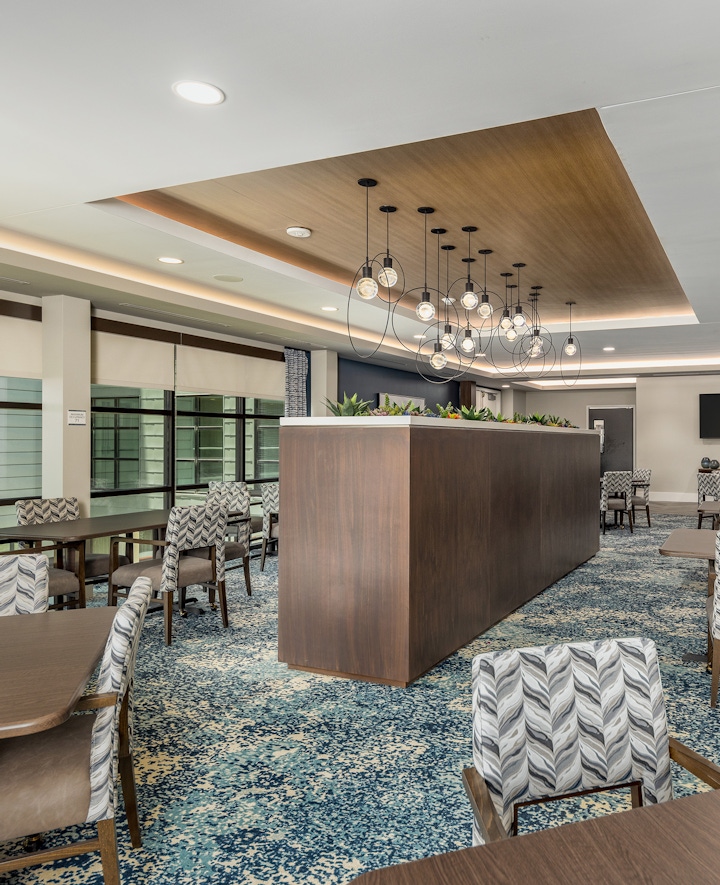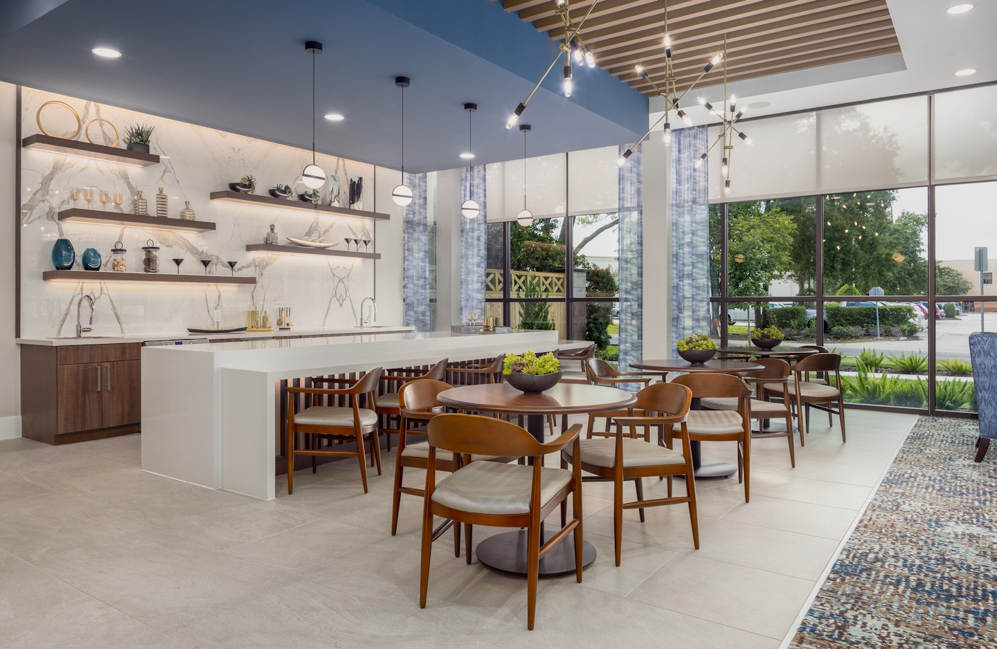 Tanglewood's rich landscape is adorned with majestic live oak and magnolia trees along its perimeter, serving as both a physical influence and a symbolic representation. These trees, with their deep roots, intertwined branches, and lush green leaves, embody the interconnectedness of the buildings, active lifestyle offerings, and residents' longevity. The interior design harmoniously integrates vibrant colors, textured materials, and carpet patterns inspired by the bark and branch-like forms, while upper-level lounges provide a picturesque view that honors one of these trees. This seamless fusion of the existing and new elements has established the ideal setting for a thriving older adult community.