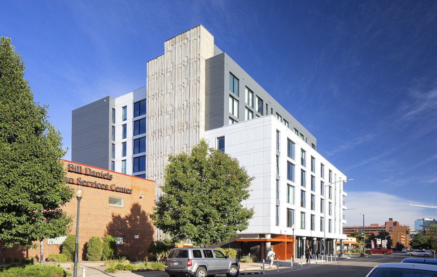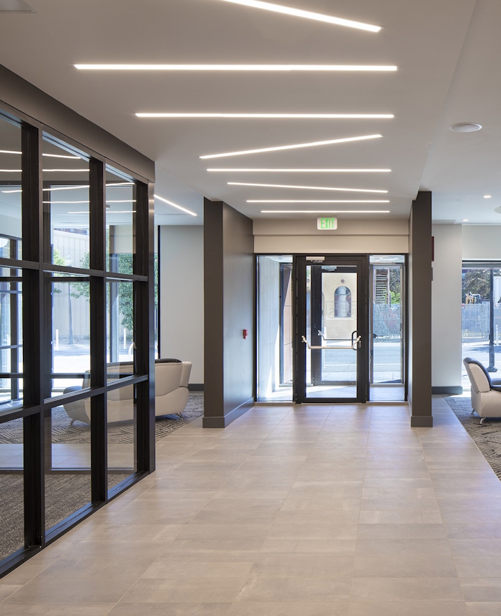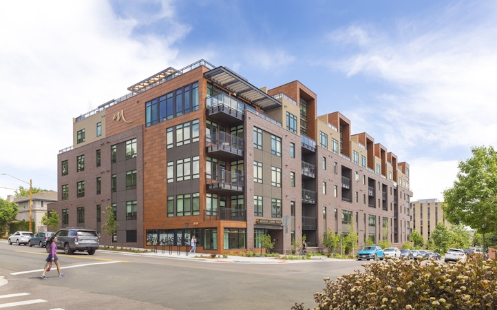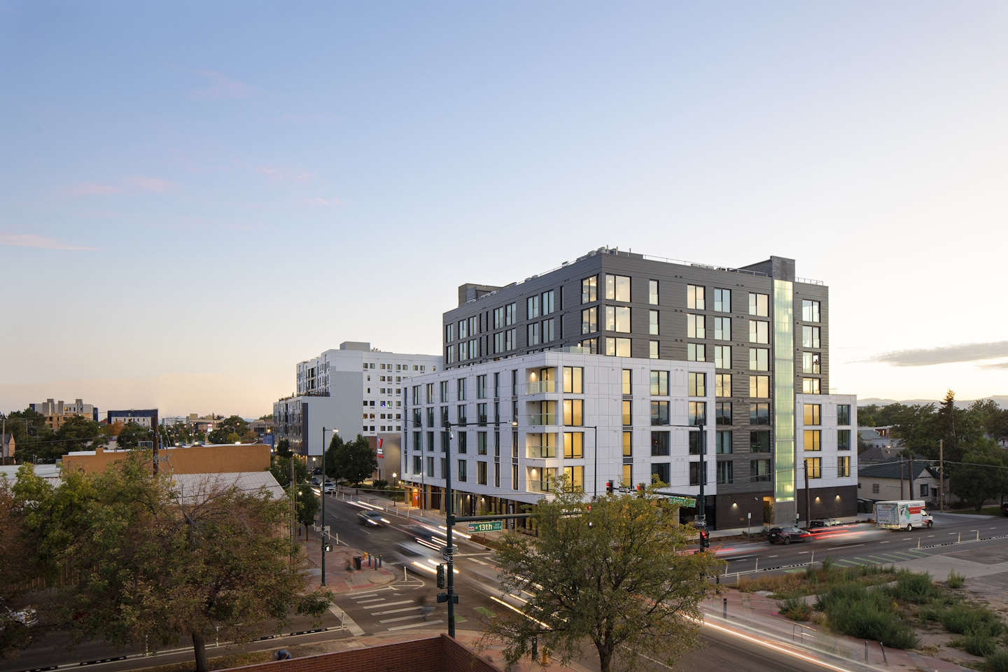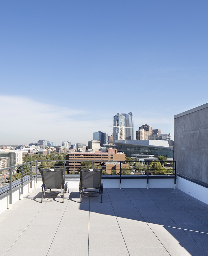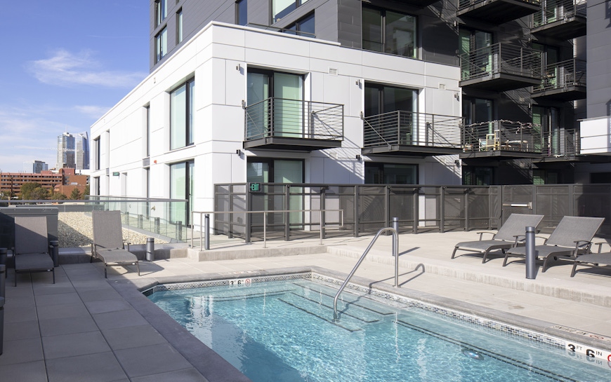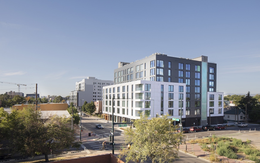 The Art District Lofts sit between Denver’s Santa Fe Art District and Lincoln Park, blending the art district's vibrancy and the neighborhood's cultural context. OZ designed the building with a white base reflecting Santa Fe’s artistic energy and a formal gray façade, nodding to the simplicity of Lincoln Park's heritage. The project offers attainable living with studio, one-, and two-bedroom units ranging from 415 to 950 square feet. Large windows provide abundant daylight and views, while amenities include an elevated pool courtyard and rooftop deck with 360-degree views. Ground-floor retail space, artist-designed columns, and a transparent storefront create a lively, pedestrian-friendly environment.