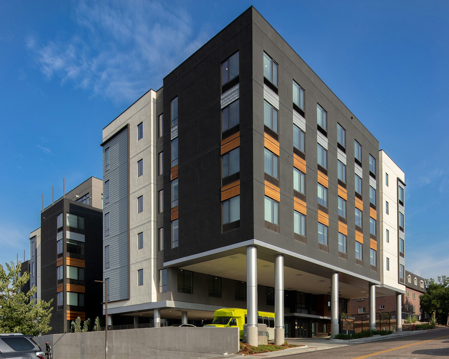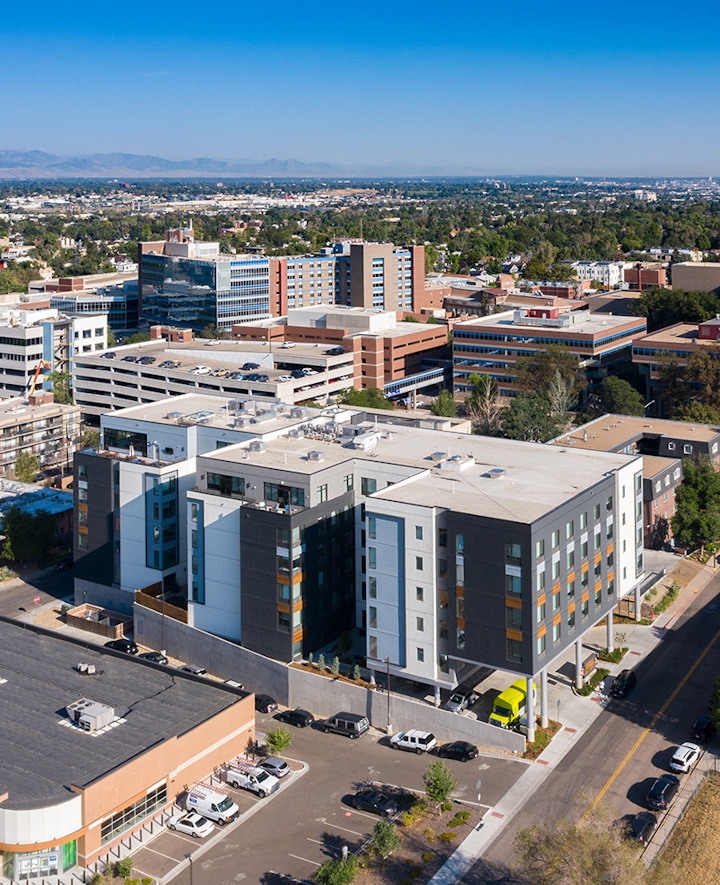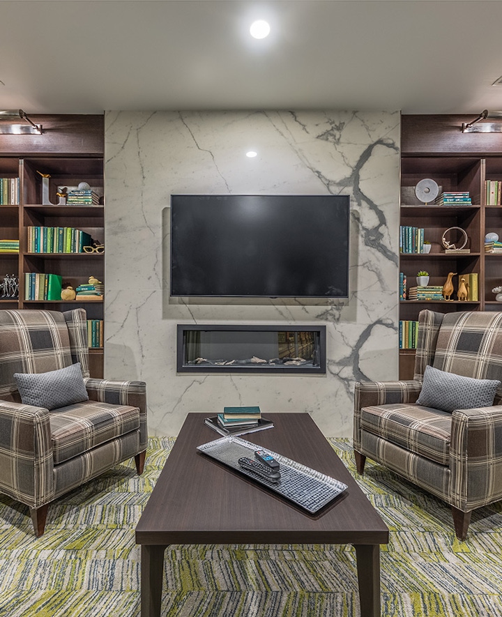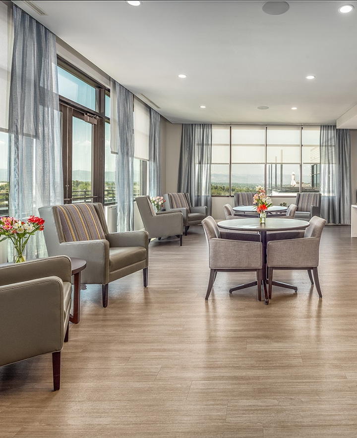 Atria was designed with the active senior in mind; and provides a variety of activities for the residents, while also considering their comfort, security and dignity. By blending modern sensibilities with the practical needs of an aging community, Atria Englewood is helping usher in the new era of senior residential design. The six-story building is conveniently located between the Swedish Medical Center and I-285, with easy access to pharmacy and post-acute rehabilitation services. The building features an underground parking garage, two private courtyards, and several on-site amenities including a café, club room, salon, fitness center, activity kitchen, and library. One of the highlights of the project is the sixth-floor dining room which has unobstructed, panoramic views of the mountains.