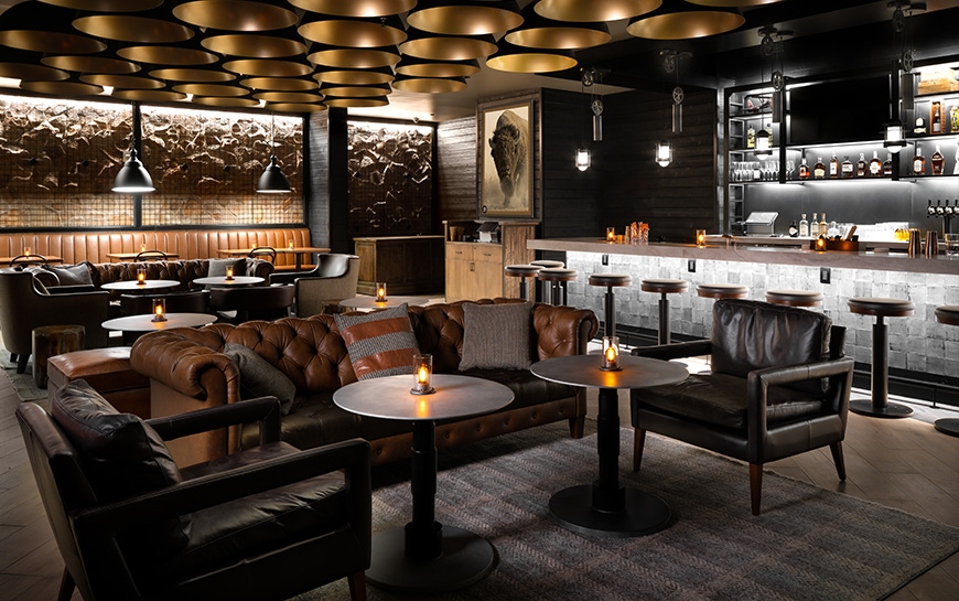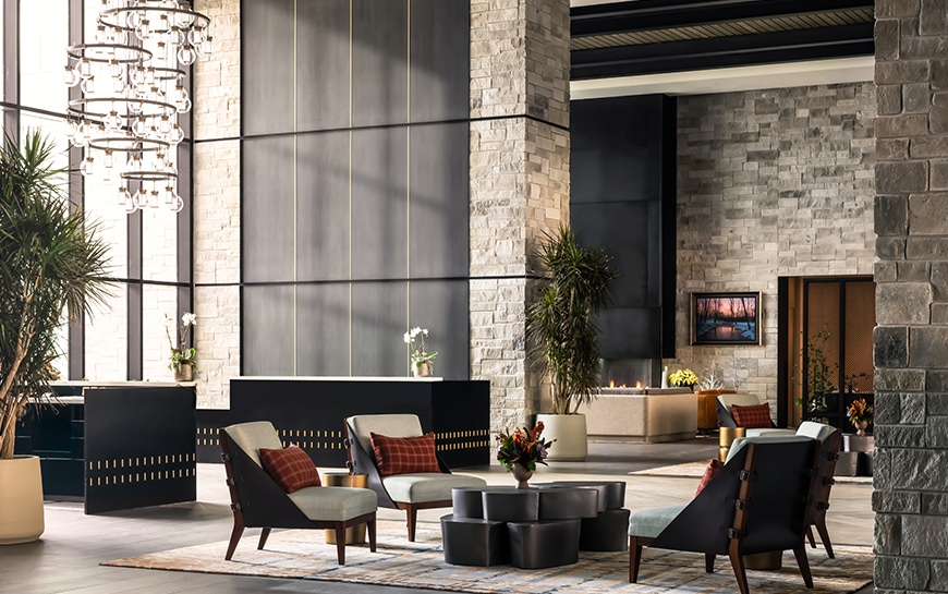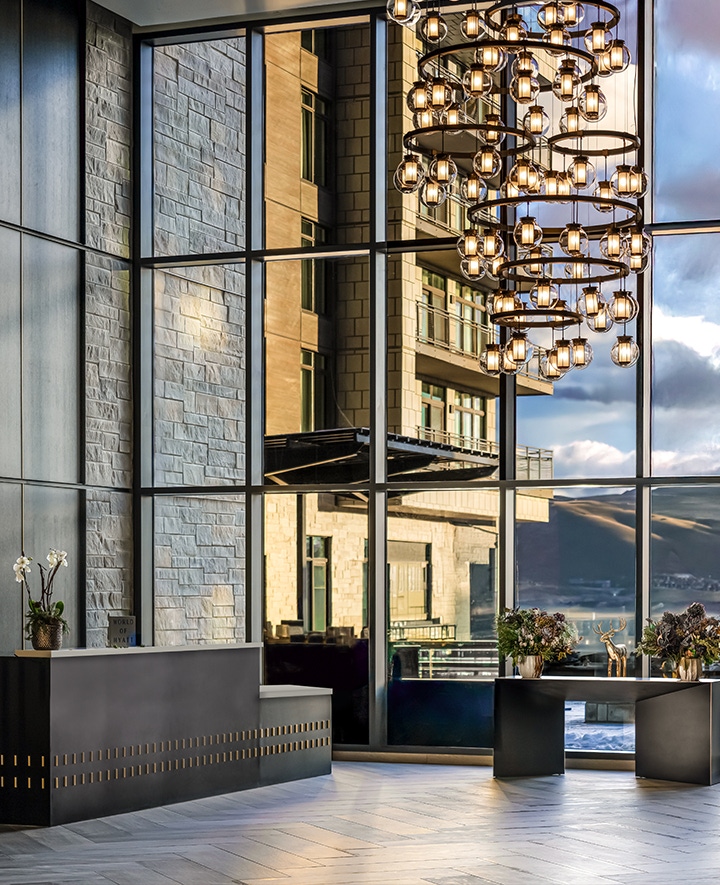 Upon arrival, guests are welcomed by a dramatic 26-foot cantilevered entry canopy that extends into the lobby and hotel reception, where expansive glazing frames breathtaking views of the surrounding mountains and valley beyond. This striking entrance sets the tone for the hotel’s connection to its mountainside setting. The building’s exterior, clad in raw metals and a natural stone-wrapped base, grounds the structure in its rugged environment. Feature elements on the building were inspired by the metals once mined here, and ‘mineral boxes’ are used to create interest and to articulate the façade. Large windows punctuate every elevation, capturing stunning vistas of the ski slopes and the Jordanelle Reservoir, filling the interiors with natural light.