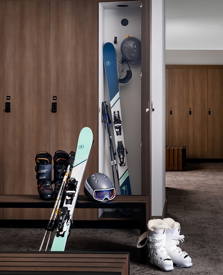 The guest rooms and suites reflect a refined mountain charm, combining luxurious finishes with a timeless aesthetic. Residences on the top floors elevate the experience further, featuring vaulted ceilings, double-height glazing, and spacious decks that blur the lines between indoors and out.