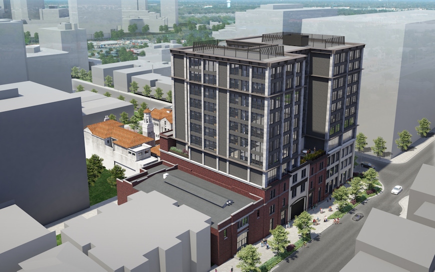 Grant Street Hotel is a new boutique hotel developed by GFI Development Company, converted from Denver’s Historic Cathedral High School building at 1840 Grant Street. The Seton House and the Historic School occupy the site, both once owned by the Archdiocese, and will be renovated and repurposed into a new hotel that celebrates the building’s heritage throughout the exterior and interior. The school’s former gymnasium located across the alley will also be preserved, transforming it into a unique amenity space open to the local community. A ground-up building is planned for what is currently the parking lot adjacent to north of the gym.