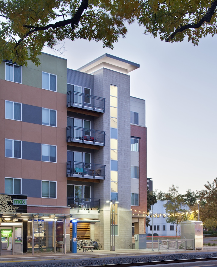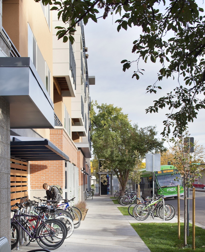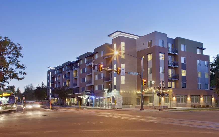 Max Flats set the tone for future development and revitalization of Fort Collins’ Mason Street corridor. The project is strategically situated along the bus rapid transit system and helps foster multi-modal connectivity to campus activities and downtown retail development. As the first project to meet the City’s renewal goals, Max Flats is defined by notable architectural features: a bold color scheme, exposed steel structural canopies, rich brick and stone facades, sustainable green walls, and exterior patios for informal gatherings.