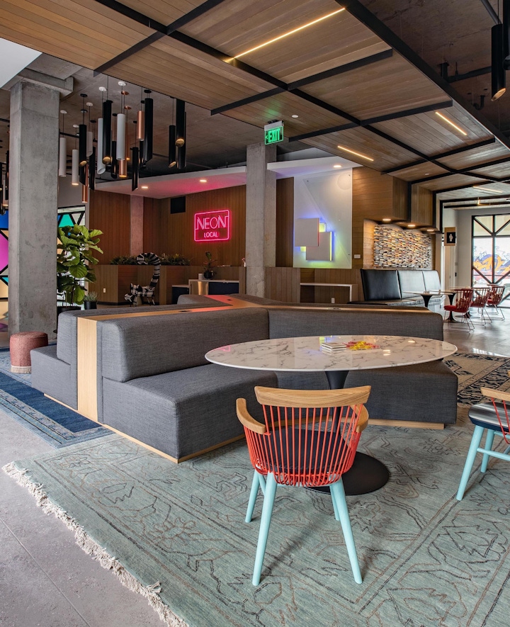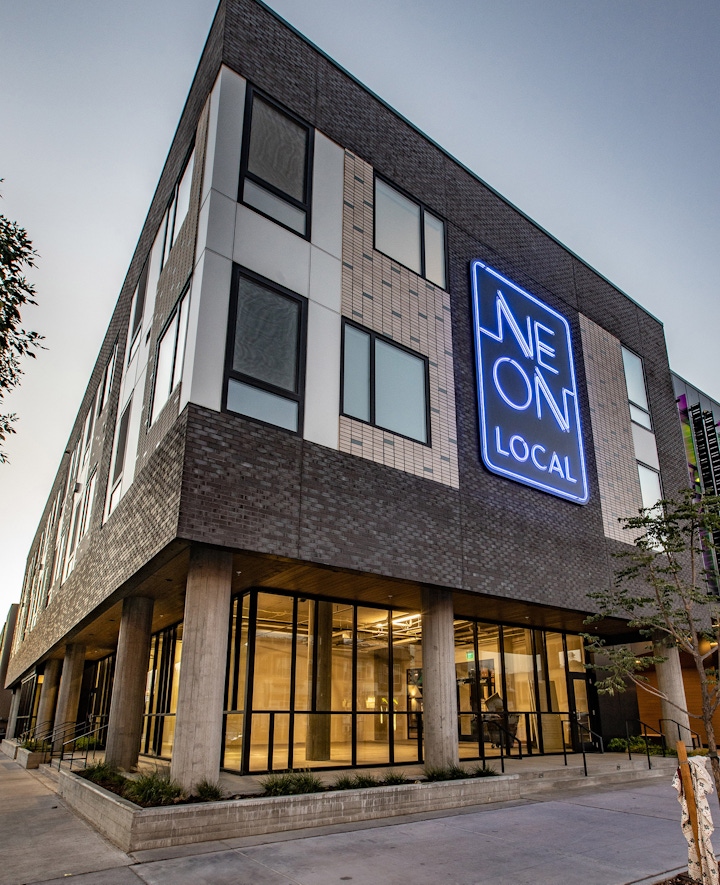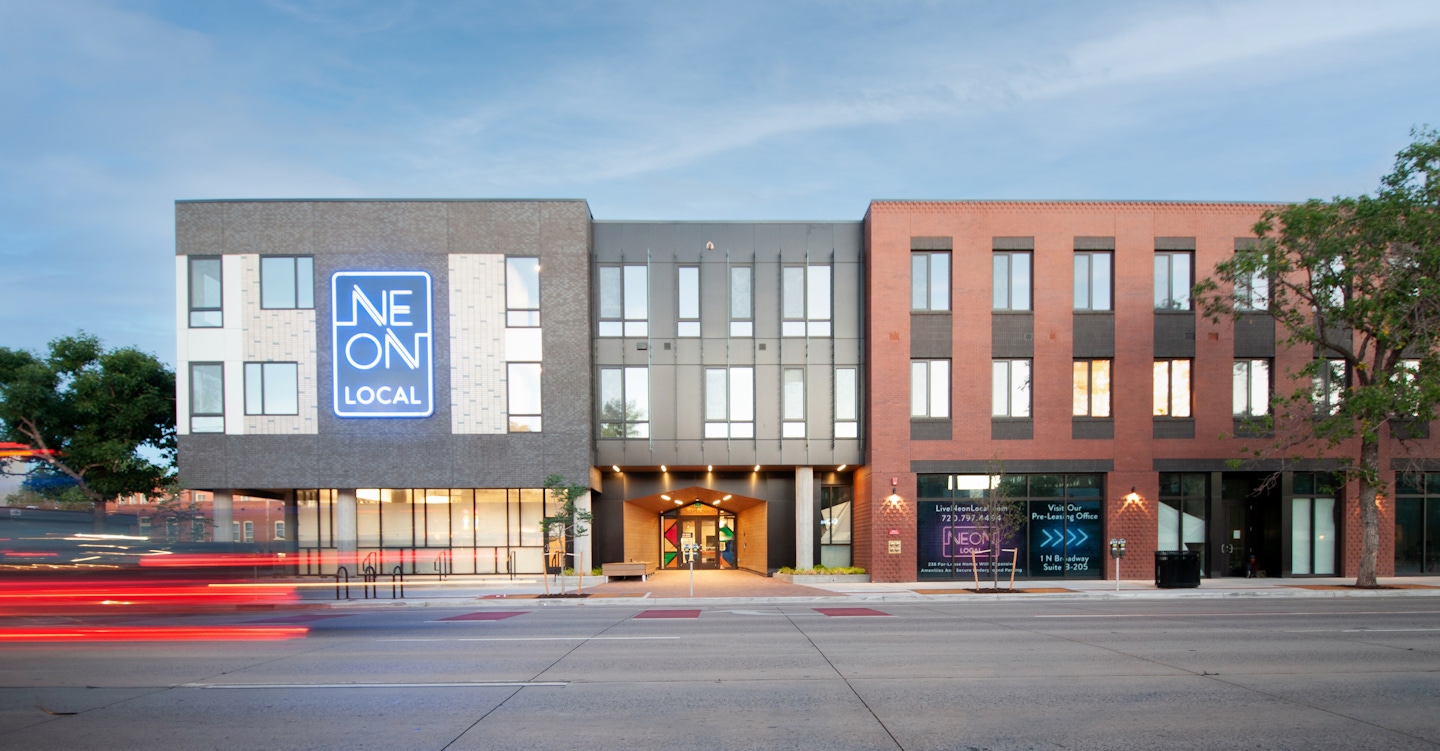 Neon Local reflects the energy of Broadway and shares the richness in scale, texture, and materiality with the historic Baker neighborhood. Its design nods to the area's gabled roofs and creates a modern yet harmonious presence in the South Broadway corridor. With over 13,800 square feet of ground-floor retail and restaurants, plus 238 apartments above, it activates both the commercial corridor and surrounding neighborhood. Ground-level units along Bayaud and Archer enhance street-level engagement. A west-facing rooftop terrace offers outdoor amenities and stunning Front Range views, making Neon Local a vibrant addition to the area.