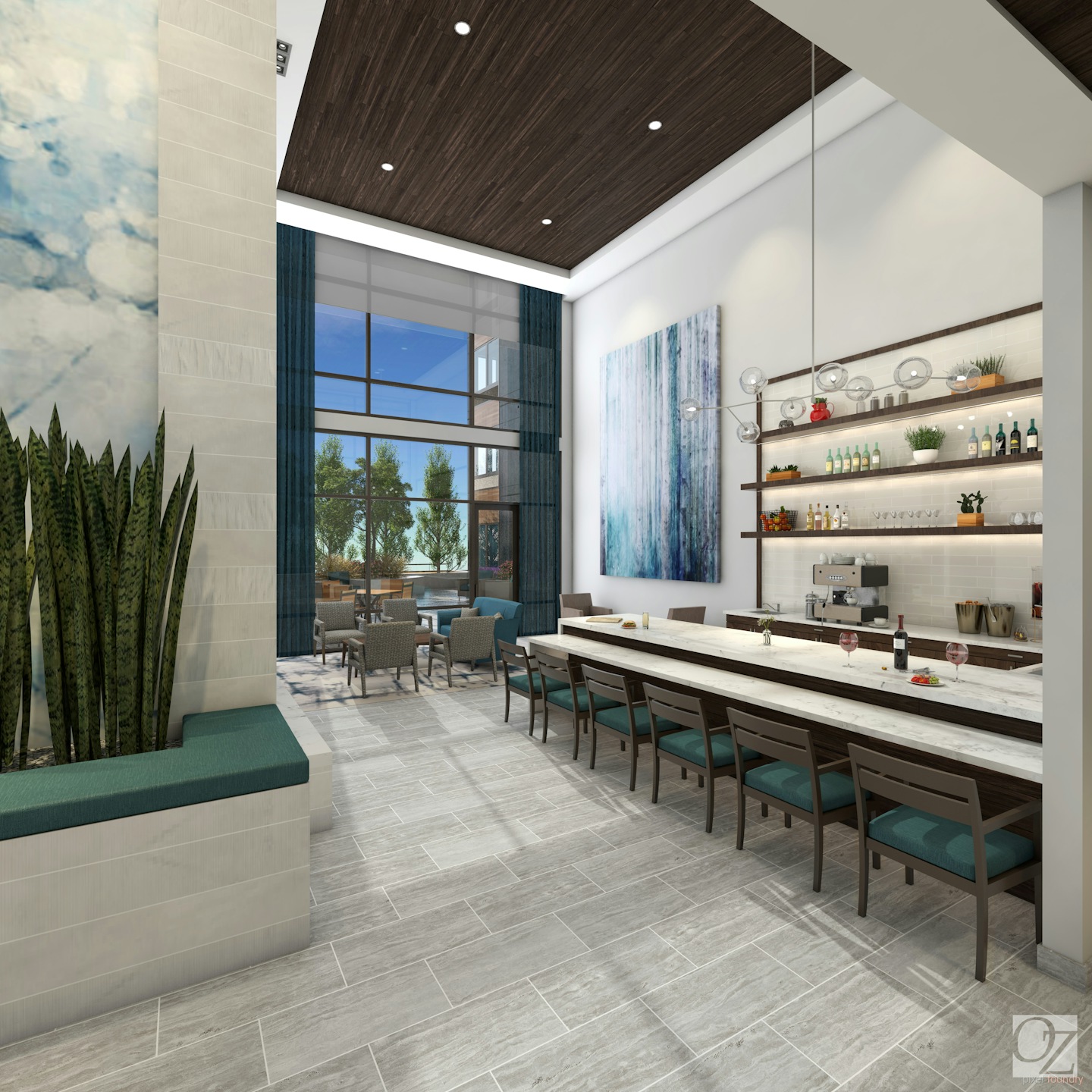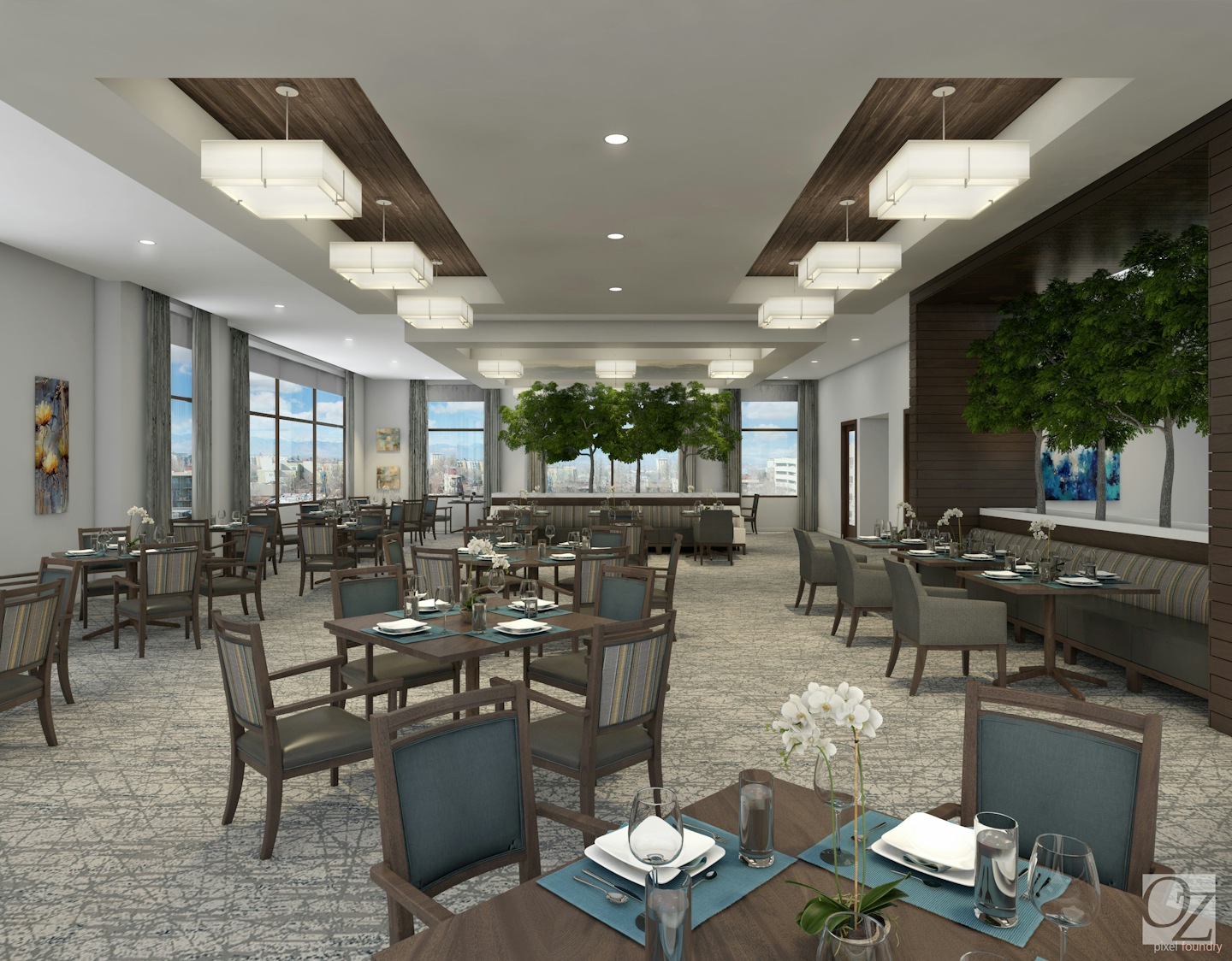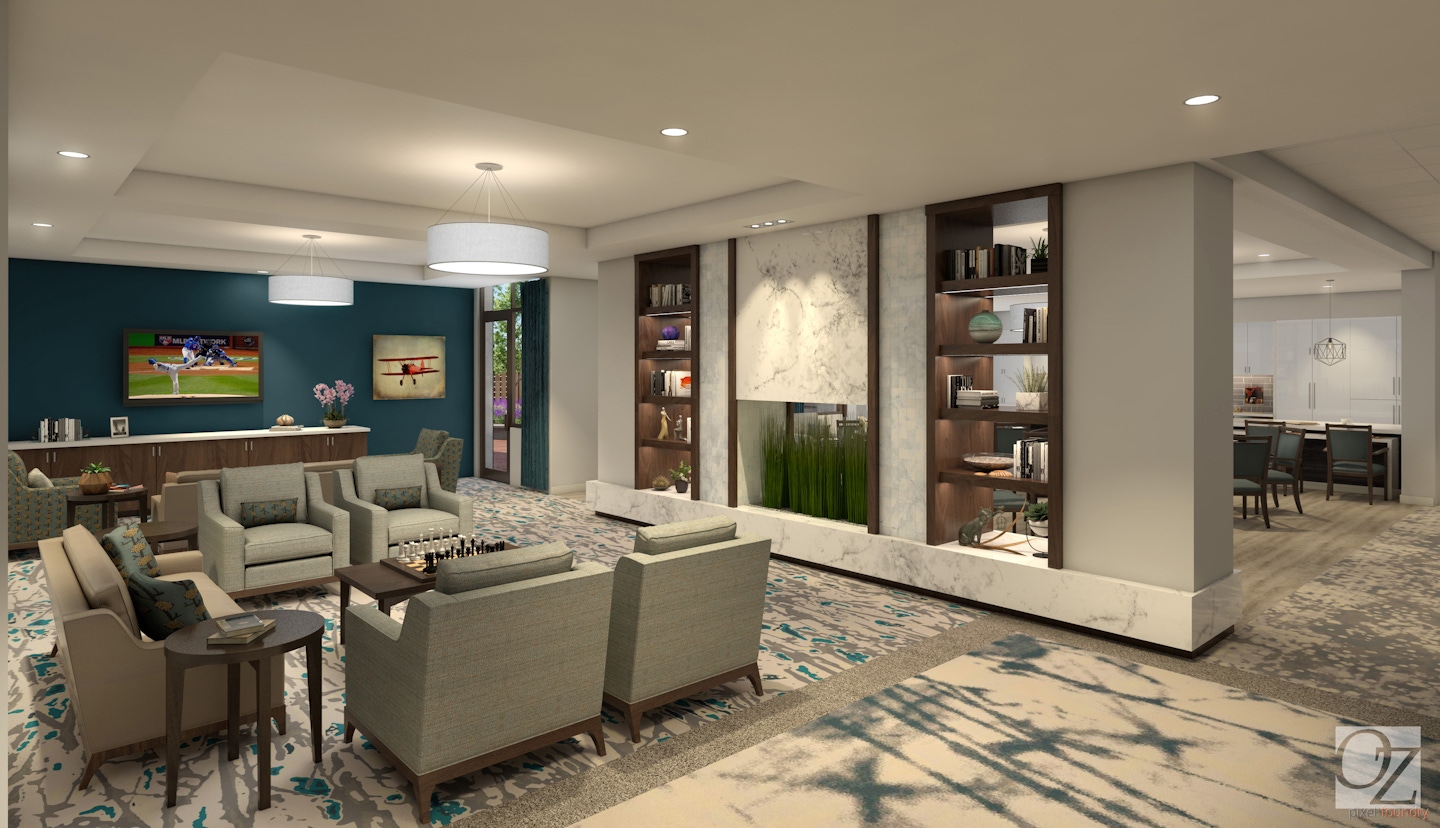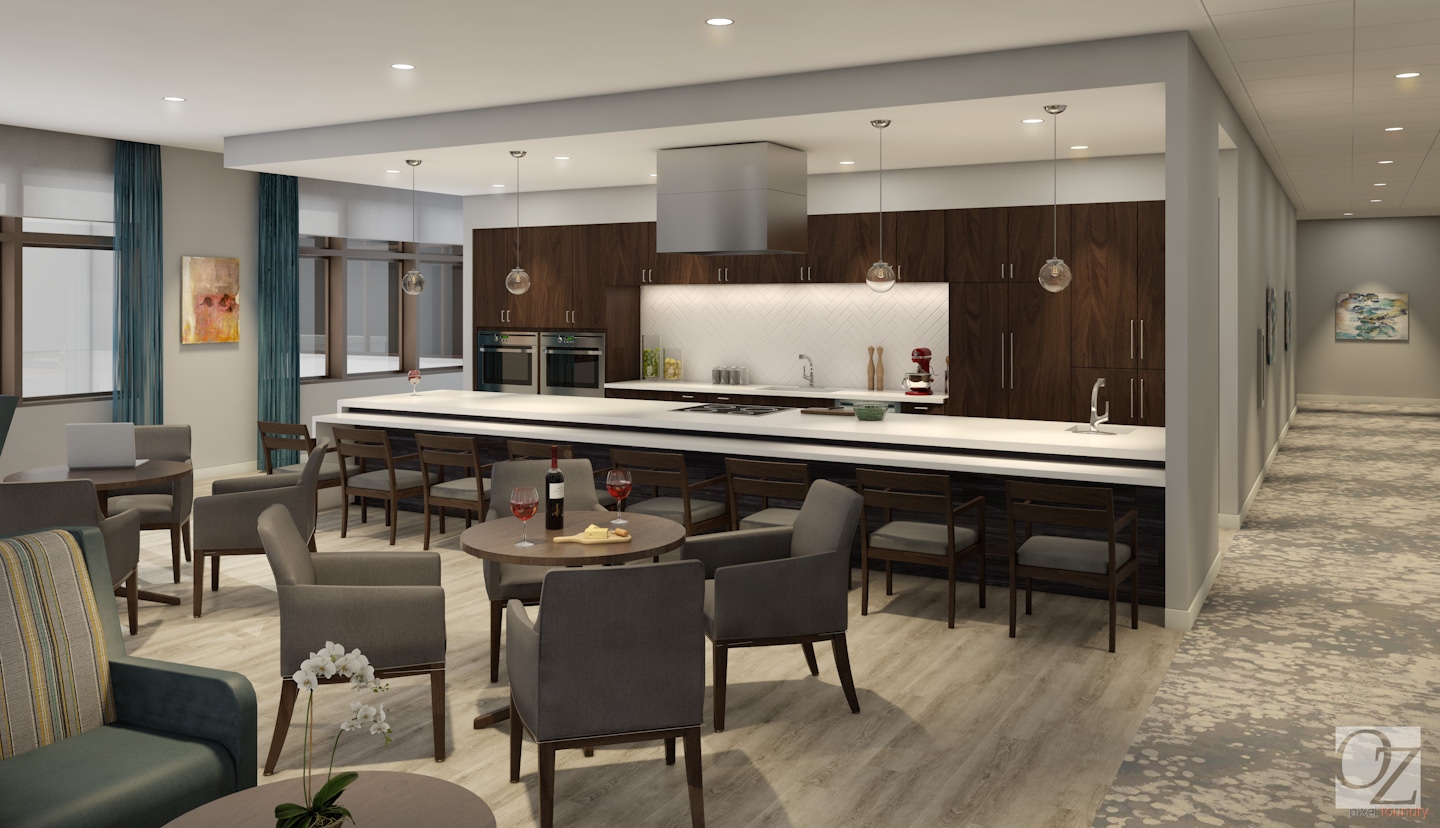 The design also includes an underground parking garage, two private courtyards, and several on-site amenities. Crisp colors, modern finishes and natural wood elements create an up-to-date yet warm environment. The two-story lobby features a grand fireplace and bistro with morning breakfast and full-service bar in the evenings, as well as an outdoor garden and courtyard. First-floor memory care residents will have access to a kitchen, dining room, activities room, salon and private garden. Assisted living units on the second through sixth floors will include a library, salon and fitness center.