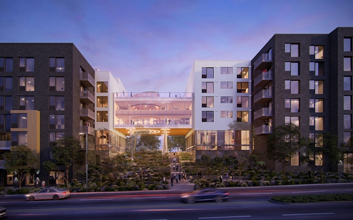 Additionally, this development phase fosters local entrepreneurship by housing the 7,000-square-foot "Sun Valley Food Hub," hosting five food vendors and a shared commissary kitchen, promoting startup businesses in the area. Included in Phase 1 is a 220-stall, three-story above-ground parking garage designed to serve the Block 3 community. This free-standing garage is fully wrapped by the various residential developments on this block, ensuring convenient and ample parking space for the residents while reducing the need for surface lots.