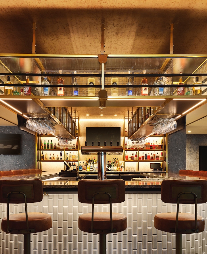 The hotel’s new restaurant, Edwin’s, is named for Colorado’s first naturalist, paying homage to the region’s commitment to conservation. With a cozy wood-fired pizza oven, an expanded outdoor dining deck, and a versatile layout, Edwin’s offers a dining experience that can adapt to the seasonal rhythms of mountain life. Natural preservation was a key component in our approach at Alpenrock. Only one tree had to be cut down to accommodate layout changes, and wood from that tree was thoughtfully incorporated into the design of Edwin’s host stand - we even left the carved initials. For more intimate gatherings, a speakeasy bar hidden behind a sliding art piece adds a whimsical touch, while a doré bar concept serves as a lively après-ski space, evoking the town’s mining heritage with custom murals and mixed metal accents blend rough and refined elements to create a distinctive look.