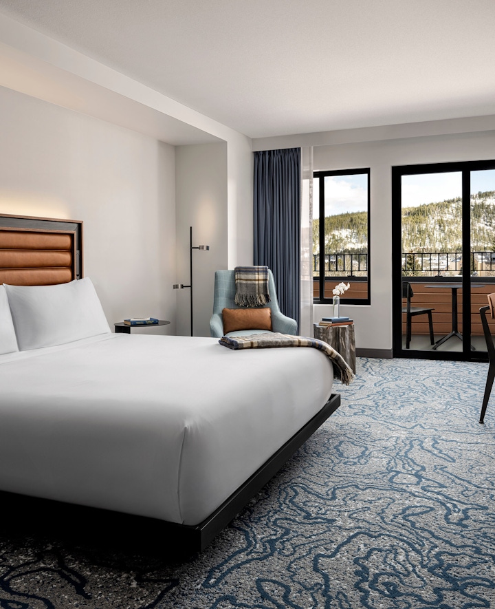 The hotel’s guestrooms have been fully updated to meet today’s needs while retaining the signature warm mountain aesthetic. Each room has been carefully updated with expanded bathrooms, custom lighting, and handcrafted furniture, creating a luxurious experience that still feels like home. The carpet pattern in the guest rooms is inspired by a topographical map reminiscent of the surrounding mountain peaks. All of the rooms fit one or two king beds, and some even fit seating areas in addition – making this a very unique property with spacious accommodations. The renovation combined rooms at the top level to create suites, which now offer family-friendly configurations, complete with kitchenettes, living and dining areas, and separate bedrooms, making it easy for guests to relax after a long day on the slopes.