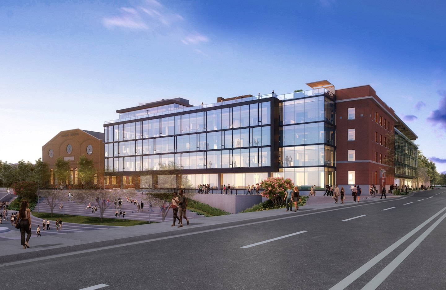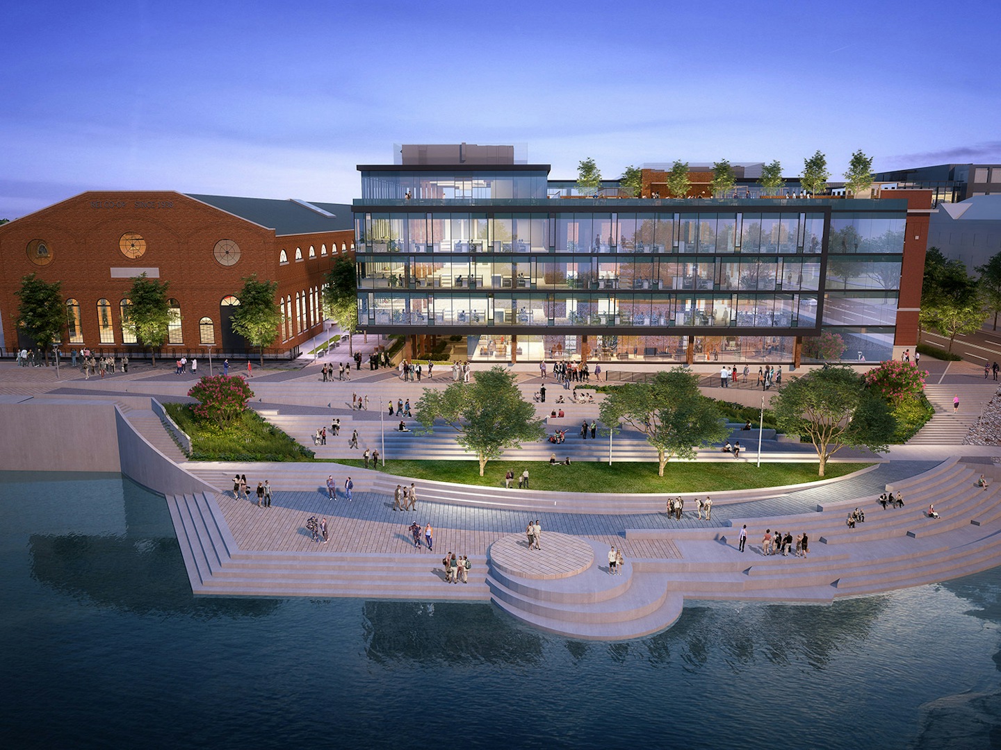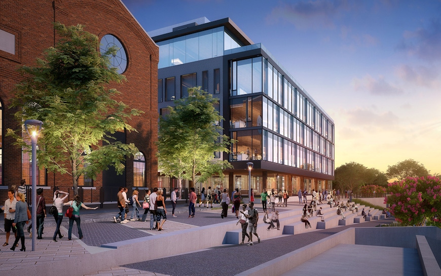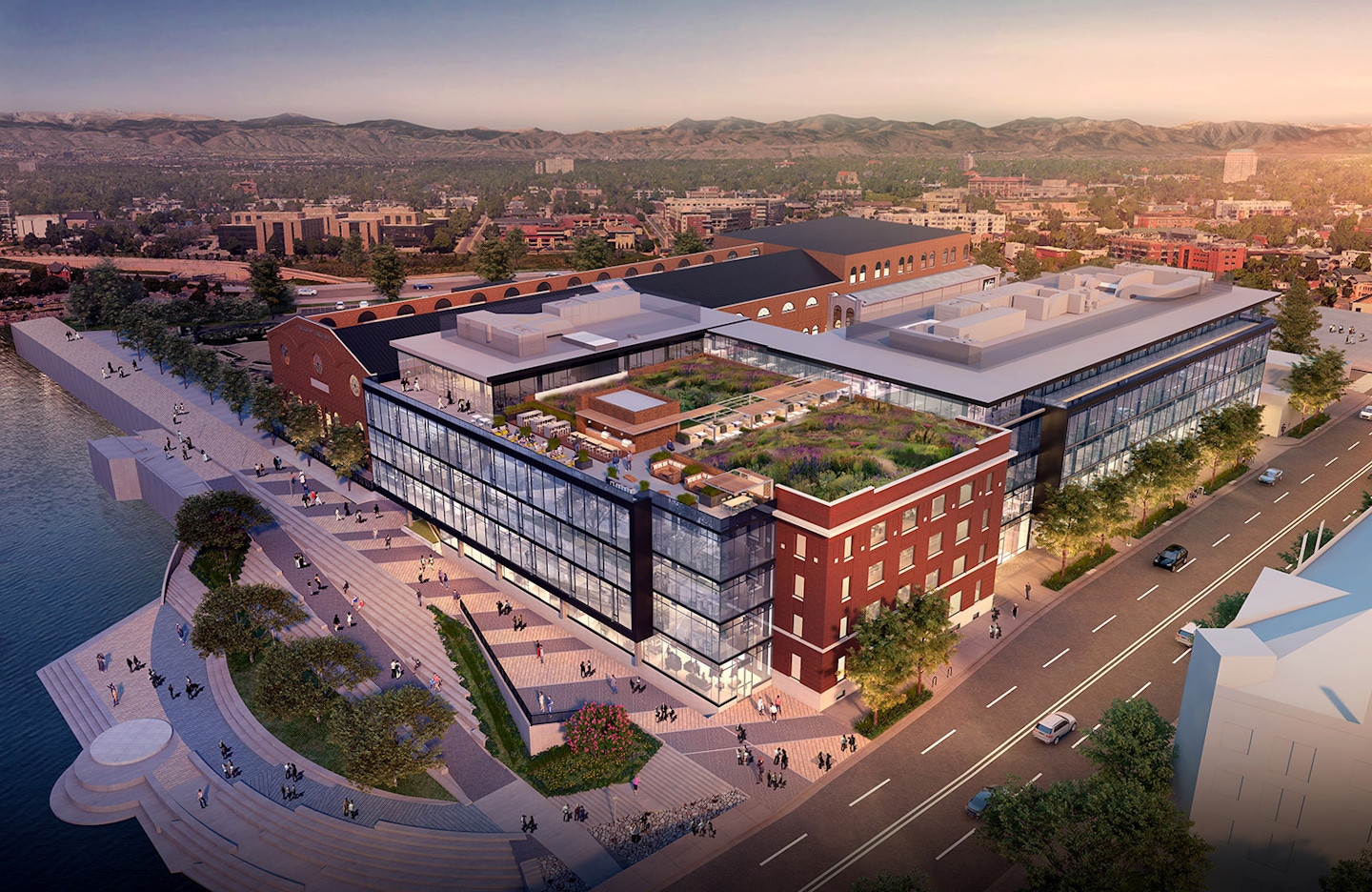 As an extension of the newly completed Platte Fifteen development, Crescent Real Estate continued its collaboration with OZ to reimagine “Riverpoint,” an existing mass-timber building adjacent to historic REI and facing the Platte River along Shoemaker Plaza. An addition planned to connect directly to the existing five-story building will make the total project approximately 196,000 sf. The project is being designed to respect the original architecture and emphasize Confluence Park's active surrounding environment. Full glazing and staggered patios facing the Platte River create one-of-a-kind views and sought-after exterior amenities. Along the façade of the building, a playful reinterpretation of the current window pattern will create an active highlight for the public eye. A covered paseo entry along 15th Street will serve as an office entry and pedestrian connection through the site.