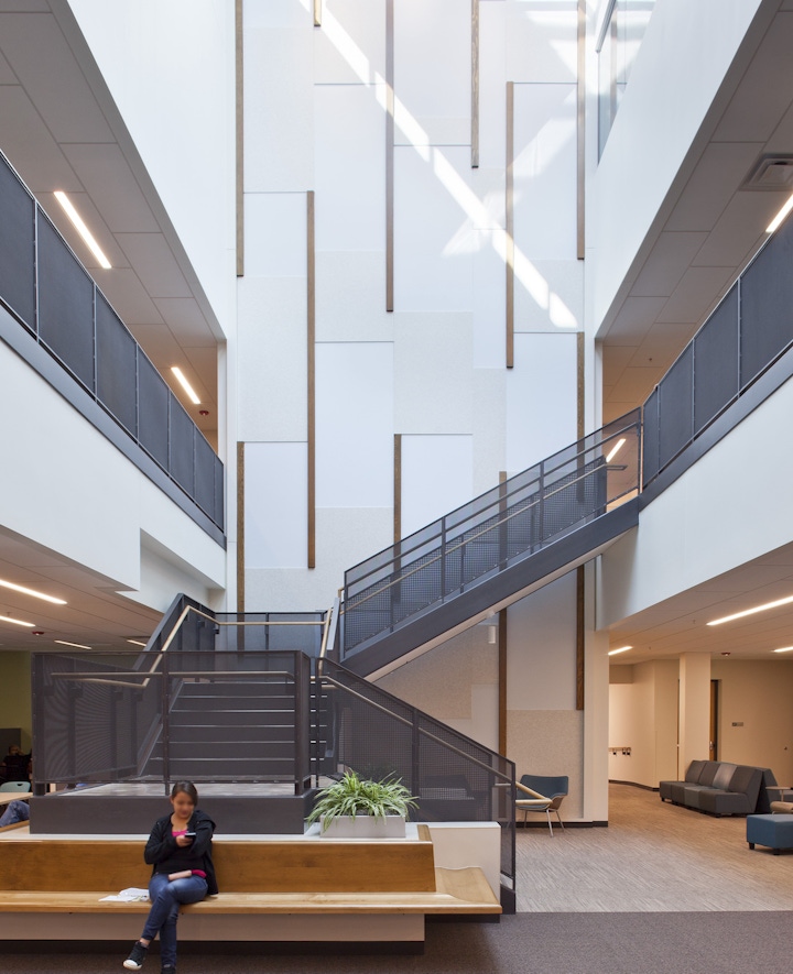 The building is LEED Platinum certified and features several exciting sustainability design elements. A demonstration garden featuring native Colorado and regional plants has been included in the pocket park at the south portion of the site. Overall, the xeric plant selections and drip irrigation contribute to an additional 67% reduction in water use for landscaping. Daylighting design strategies include interior light wells, skylights, interior glazing for conference room/offices, and tubular daylighting devices throughout the upper levels of the building. Compared to a standard ASHRAE 90.1 2007 compliant building, the design of the St. Vrain Community Hub will result in 48% energy use savings.