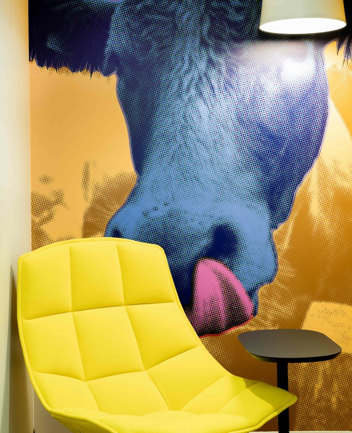 Our design incorporated natural wood materials with a wood/moss sign installation at the entry. Custom graphics are included throughout to introduce color within the neutral palette, as well as a custom cow bell art wall installation.