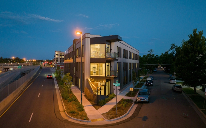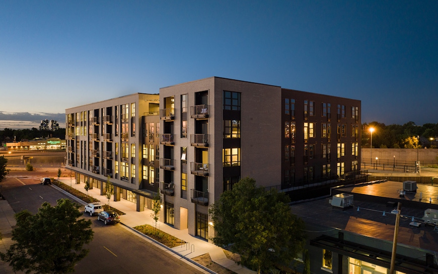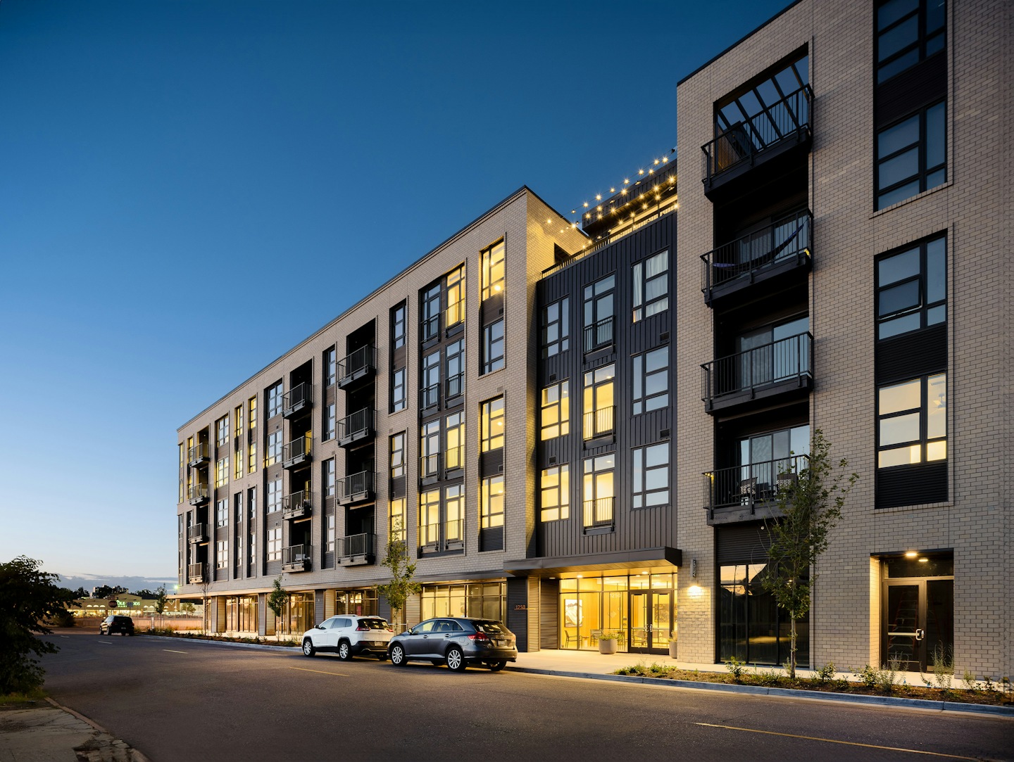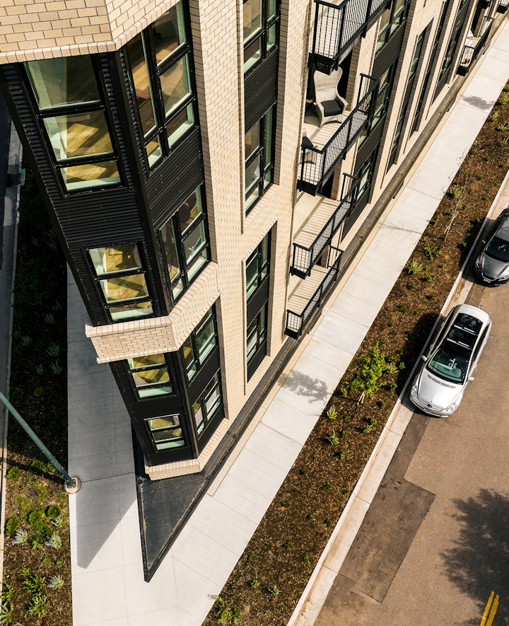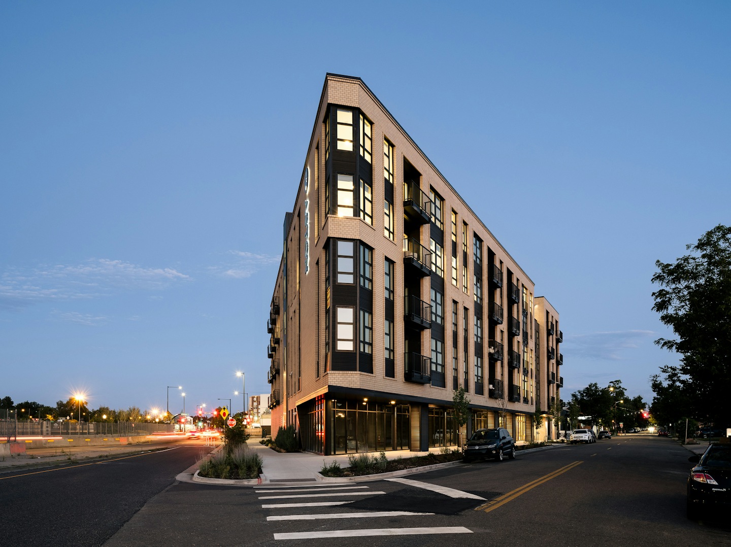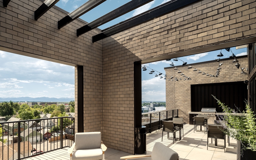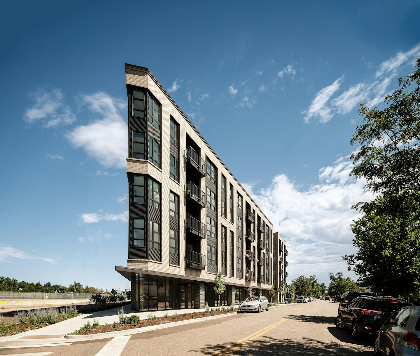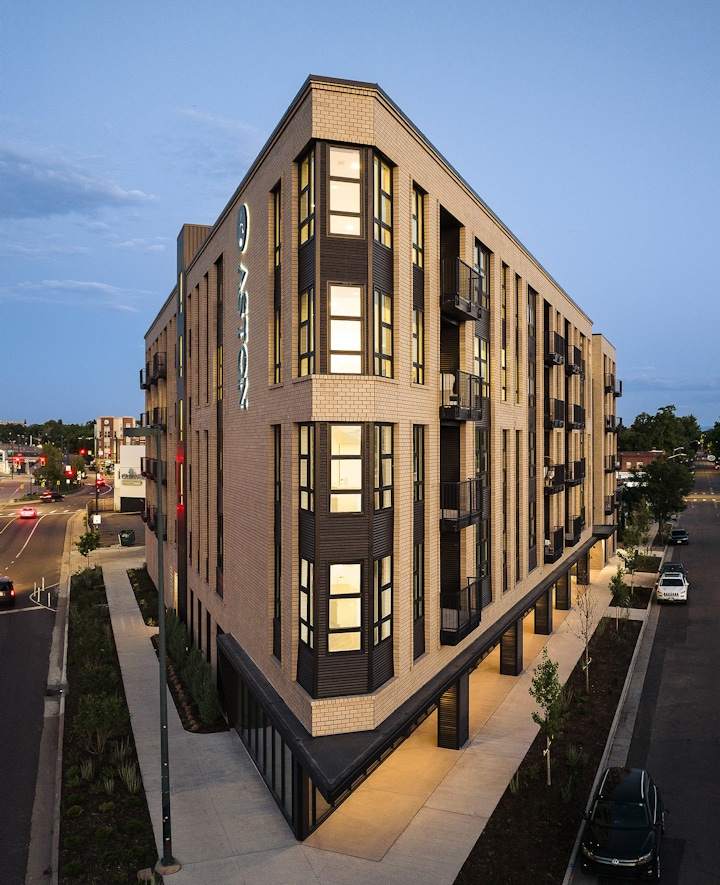 OZ’s design embraces and maximizes the triangular site geometry, serving as the masthead for South Pearl Street and the Platte Park neighborhoods. The building program includes over 3,000 sf of ground floor retail and restaurant space, a lobby and a gym space, with 73 apartment units above. The ground floor provides ample covered patio space to activate and engage the street edge, and floor 5 features a nearly 2,000 sf indoor/outdoor community amenity with unimpeded views of the Front Range. The architecture is meant to be crafted and timeless, as the building skin is constructed largely of masonry, with a very intentional set of details found about the perimeter.