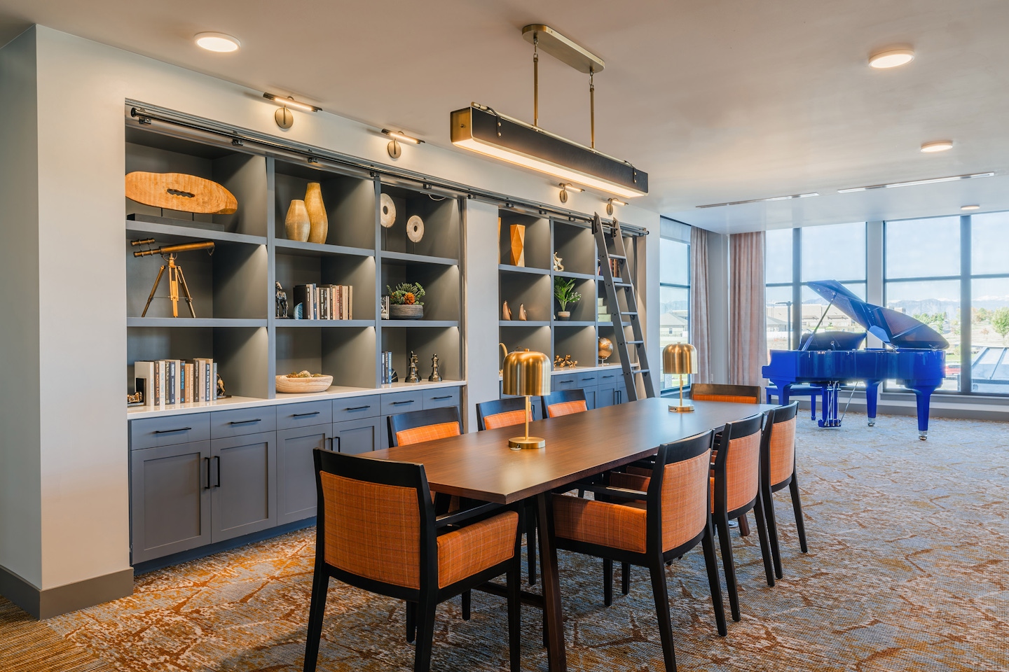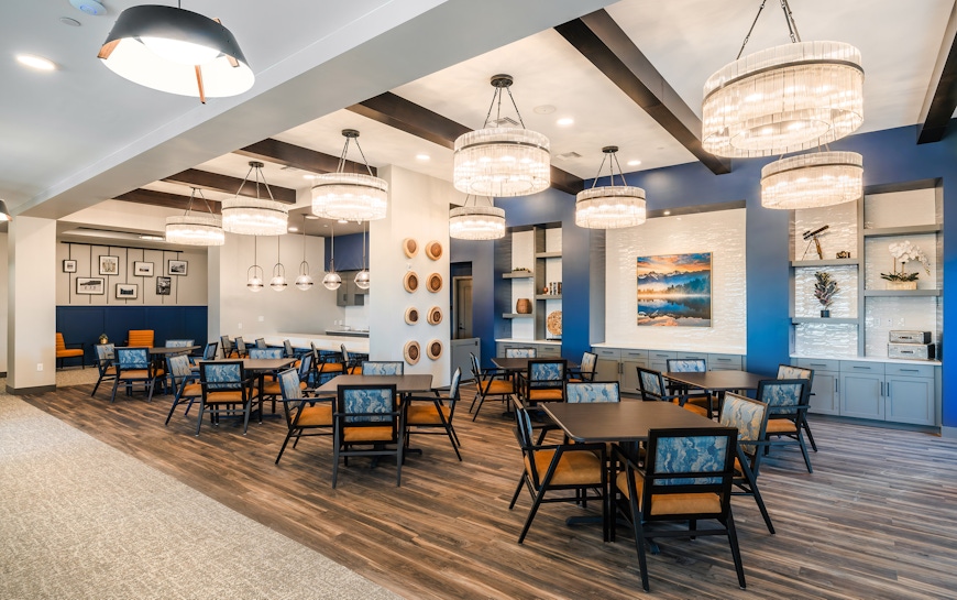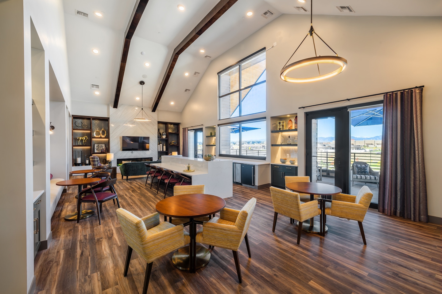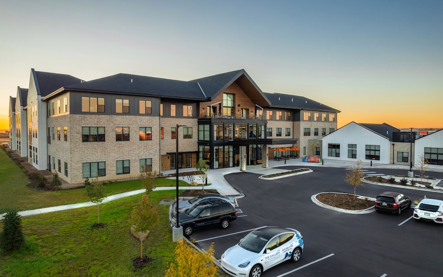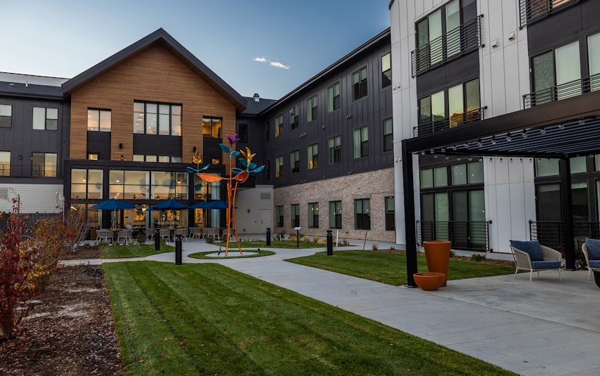 The Gallery at Broomfield stands as a testament to our team's dedication to optimizing the environment and enhancing residents' physical and mental well-being. It was meticulously planned to encourage residents to connect with loved ones, the broader community, and Colorado's scenic beauty. Deliberate measures were taken, such as providing access to sunlight for north-facing single-family homes and establishing a buffer between commercial and residential areas. Onsite walking paths offer diverse outdoor activities, and the southeast plaza can host events like food trucks or farmer’s markets. The building's exterior harmonizes the region's agricultural heritage with modern elements like stone bases and horizontal siding. Internally, a hospitality design approach minimizes walls, promoting activity and socialization in shared spaces; this thoughtful design fosters 'chance socialization' among residents. The assisted living community extends this inclusive approach across three levels, incorporating attached outdoor spaces. Resident suites prioritize natural light and simplicity, with embellished kitchens on the third-floor catering to more independent residents. The design's high ceilings and contemporary finishes create an inviting modern mountain-plains atmosphere.