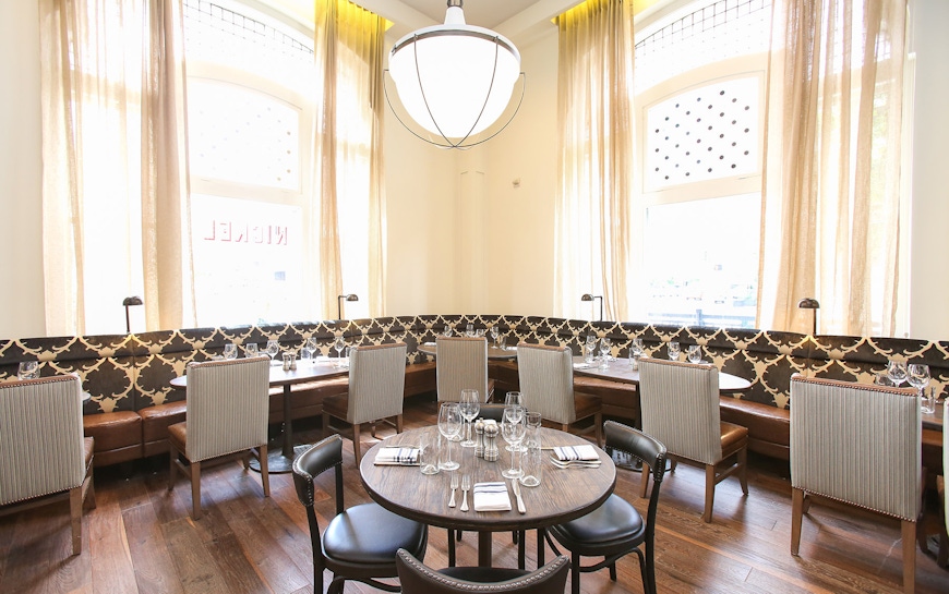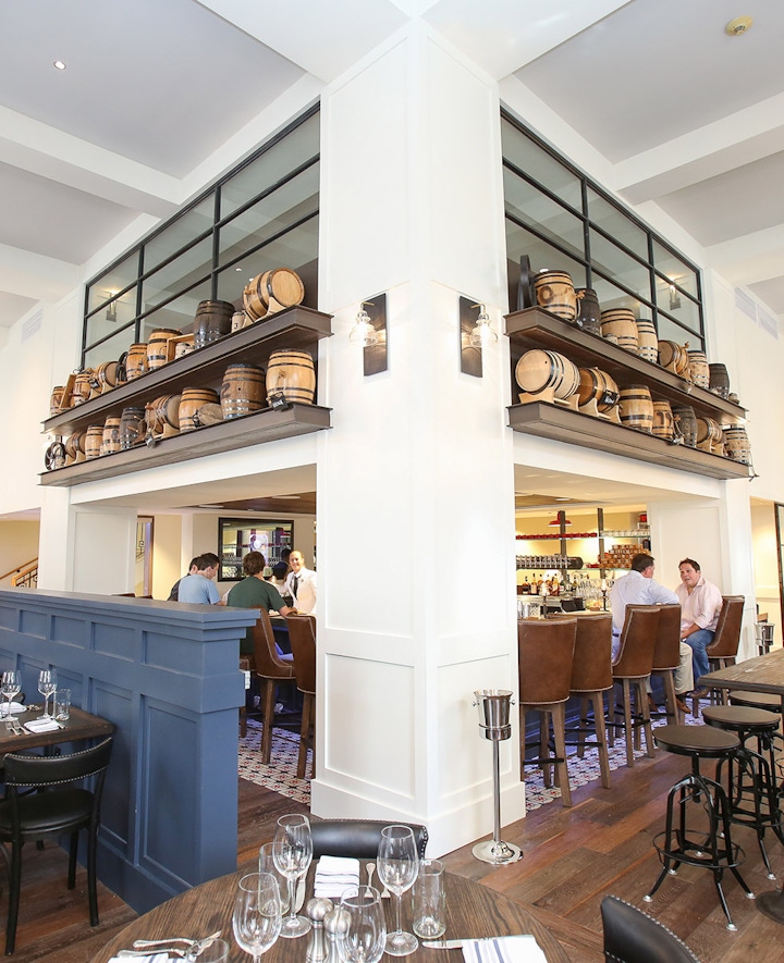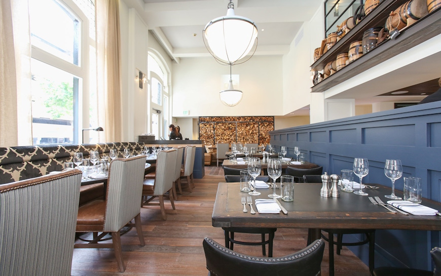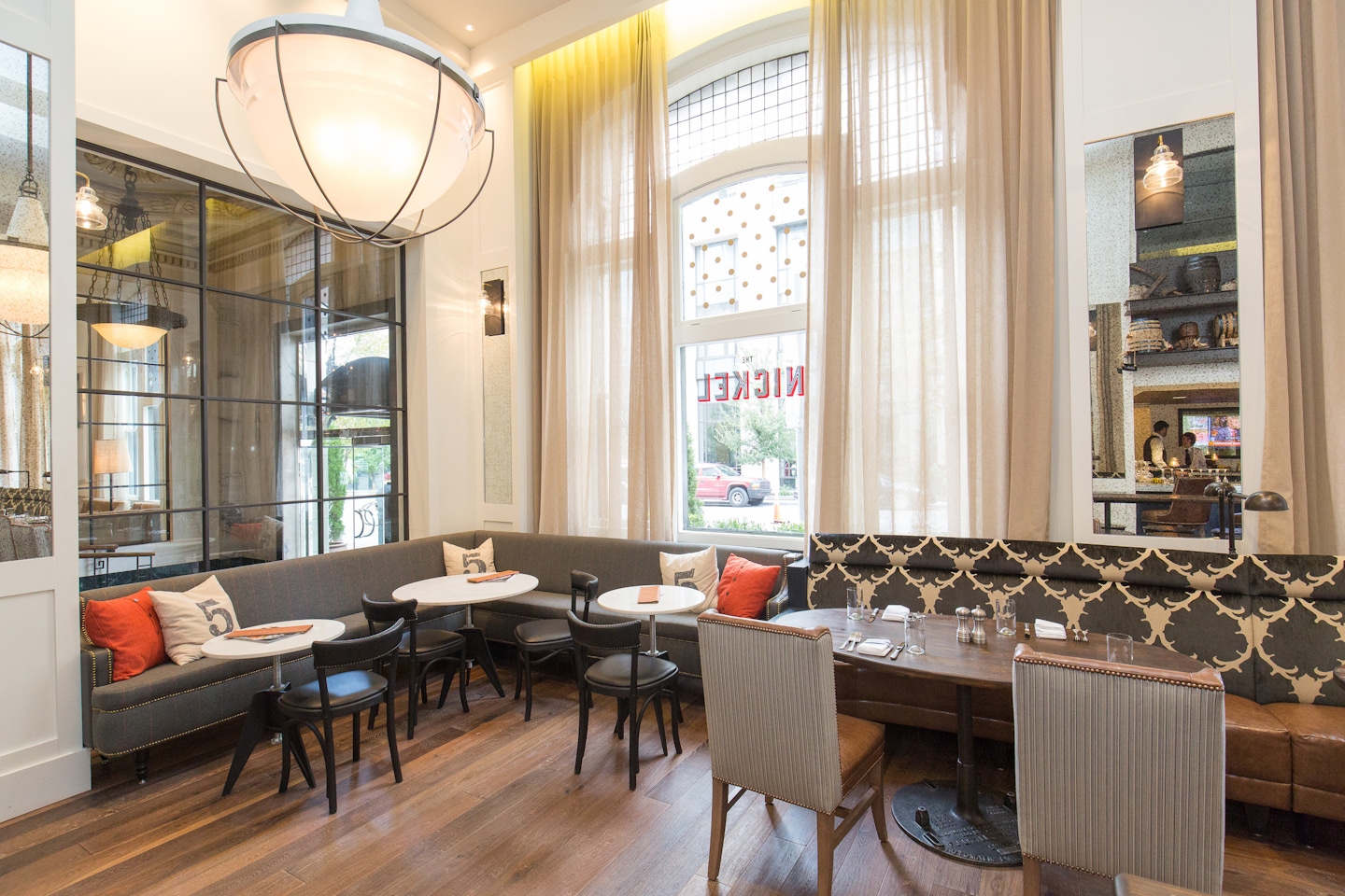A popular boutique hotel in downtown Denver’s theater district, Hotel Teatro was ready for a renovation of its first floor public spaces. OZ redesigned the first floor, reconfiguring the reception area/entry and repurposing space for a new restaurant concept, The Nickel. Part of the space became The Study, a comfortable lounge with a coffee and wine bar where hotel guests can enjoy morning coffee, sit by the fire to work or read, or unwind at the end of the business day. The high-end Nickel occupies a prime corner space with bright open windows, high ceilings, a zinc top bar tucked under the mezzanine and a fresh color palette of blues and pops of red. Small barrels used to age The Nickel’s signature hand-crafted cocktails are highlighted in the bar design. Hotel Teatro remained open throughout the fast-track construction.
