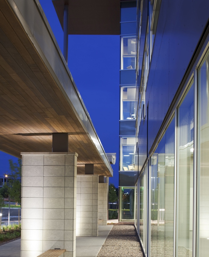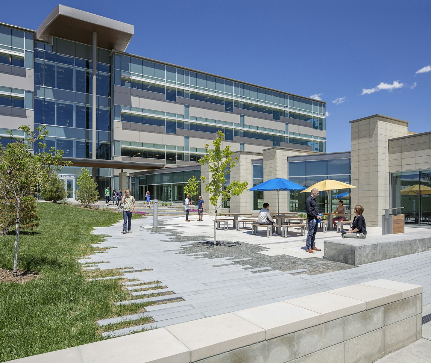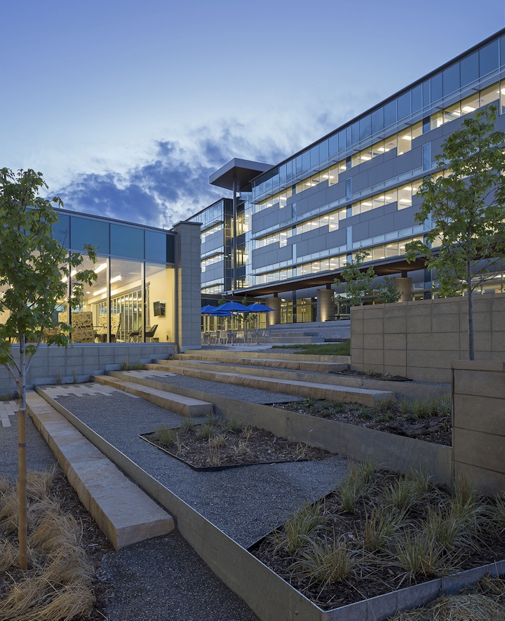 OZ developed and implemented a sustainability design strategy that balanced the goal of creating a more engaging, collaborative space for employees with a reduced environmental footprint. Phase 1 was LEED Gold Certified, and Phase II was LEED Silver Certified. To achieve a feeling of lightness and openness within the workspaces, interior light shelves were installed, which bounce light deep into interior spaces. Exterior sunshades also block direct sunlight in the summer months. The facility’s landscaping is irrigated through the City of Westminster’s purple pipe non-potable water system, and the onsite vegetated swales, filter strips, and water quality pond treat 90% of stormwater to remove pollutants before the water returns to the environment. A 600-sf parking island was planted with pear trees, raspberries, strawberries, and other edible landscaping to demonstrate feasibility of office agriculture. Overall, the Trimble office buildings achieve approximately 30% energy cost savings over the ASHRAE 90.1 2007 baseline.