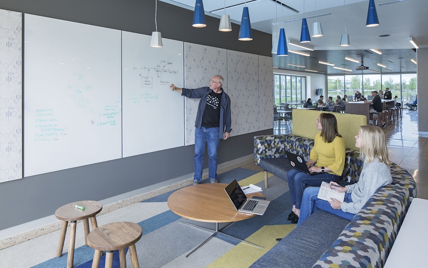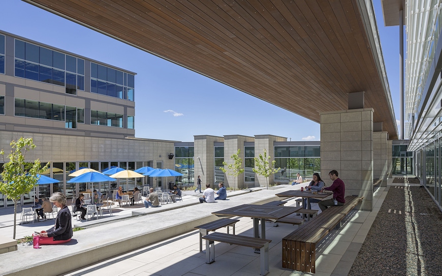 During Phase II design, the connectivity that was so successful in Phase I became a key driver. It was critical to allow employees to stay engaged with other teams across buildings. The Pavilion space connected an enclosed breezeway between the two buildings, creating a social hub that is the gathering spot between the buildings. An operable glass wall opens to a new outdoor amphitheater.