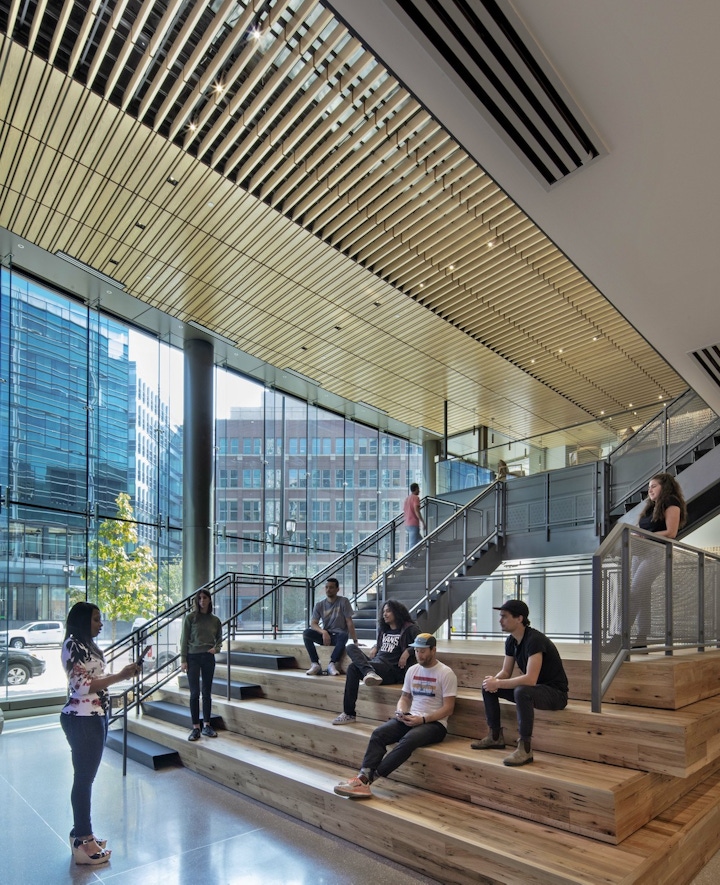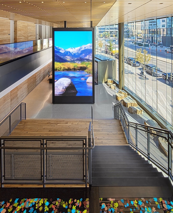 The VF brand is classic, high-quality, and values exploration of the earth. The new office space is a dynamic tribute to that. Incorporating natural materials throughout the building, the new space includes rammed earth walls, a bouldering wall and climbing wall, an altitude chamber, and other elements meant to exemplify the corporate culture. A digital tile wall highlights the lobby, as well as large boulders designed for sitting. A grand inner-connecting staircase leads to the other floors with several meeting spots designed to facilitate employee collaboration. And a 4th floor cafeteria leads to an outdoor patio with beautiful mountain and city views. The building is pursuing LEED Platinum.