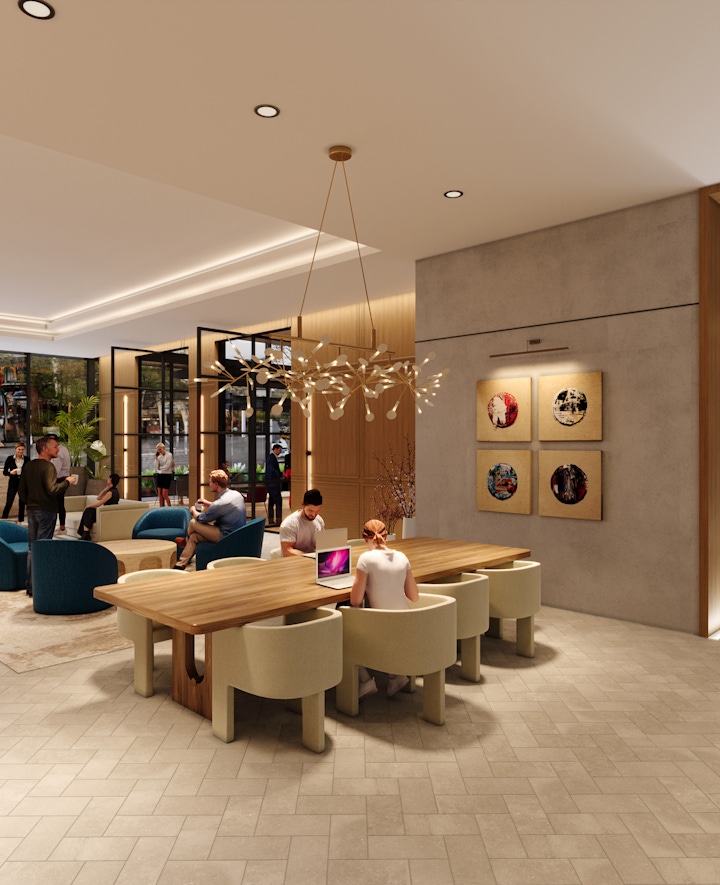 The building will buffer the adjacent residential/office mixed zoning. The design, characterized by pronounced brick detailing and a jewel glass form, contributes to and complements the urban fabric unique to this transition between high-end single-family and commercial corridor. Notable features include an active roof deck restaurant with stunning views, a unique indoor/outdoor level one restaurant/bar, and an interior lobby open to the bar area.