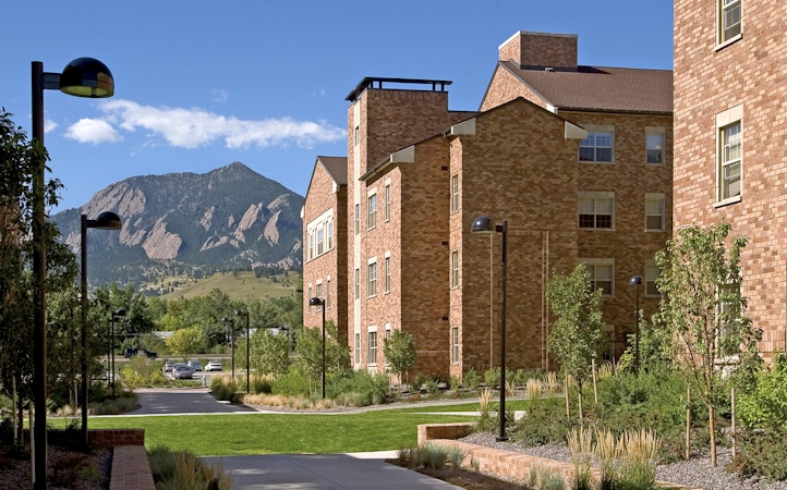 Acasia provides a unique off-campus housing experience for CU students, emphasizing amenities for each tenant and community spaces for engagement with their surroundings. Located directly across from campus, each unit has an exterior balcony to enhance its visual connection to the university and the surrounding foothills. Engaging the building with the exterior was a critical focus of the design. This was achieved through internal south-facing courtyards, with lush vegetation and overhead festoon lighting for evening gatherings. The “Paseo” between buildings offers more lush plantings, vegetative screen walls, and festoon lights. Each student’s needs for a comfortable living environment are met with a private bathroom off every bedroom and an open central living space with an exterior balcony. The recreational lounge and fitness room adjacent to the main lobby promote student connectivity. It flows seamlessly into the lobby, which energizes the space as a social hub for the tenants.