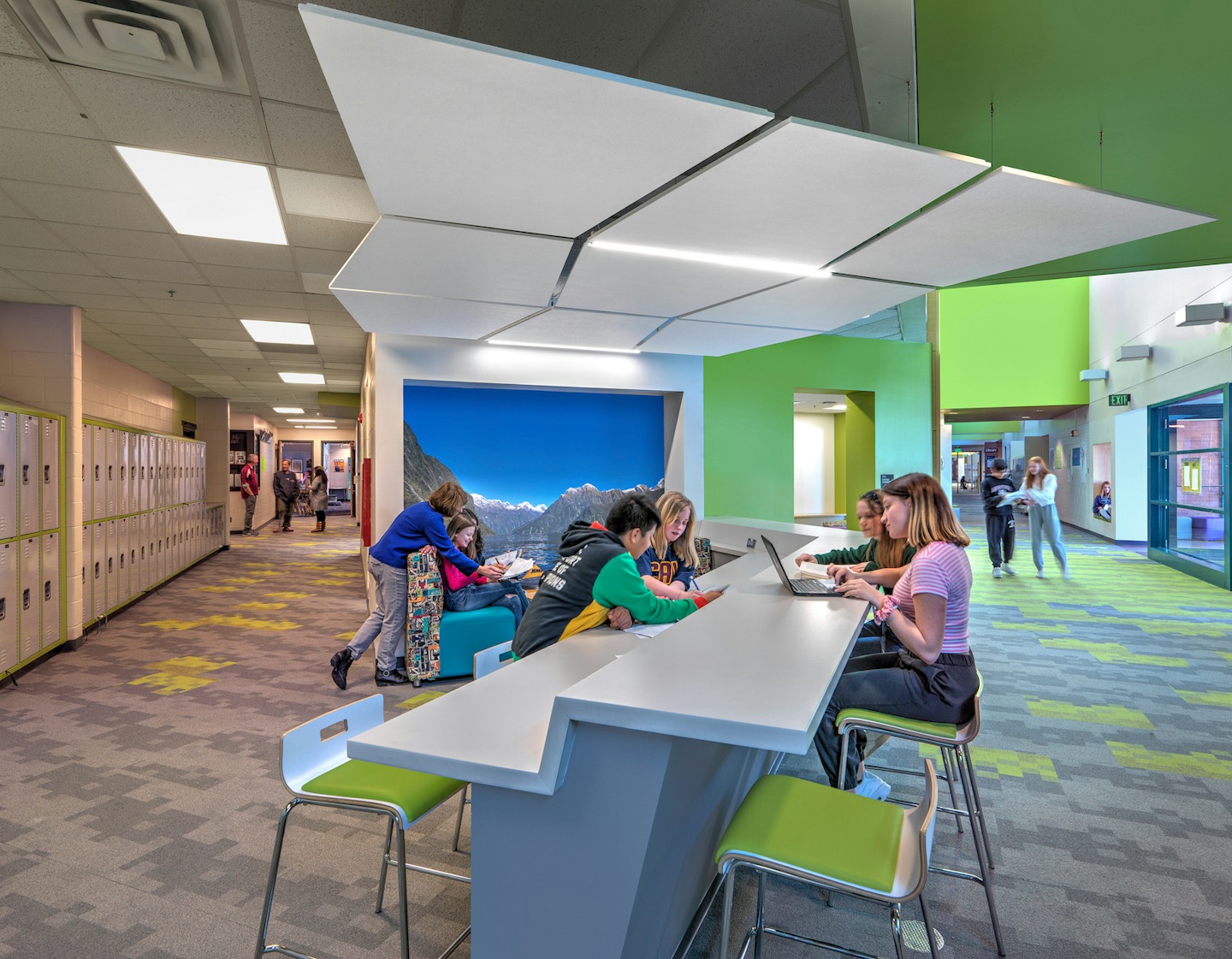 Boulder Valley School District had two parallel projects–first, to remodel the school, and second to create the spaces that support innovation in education. OZ immediately recognized the value in combining the two projects, both budget and scope, and the school was able to update their image and reposition the learning environments. The school’s highly visible corridors were updated to a more mature and relevant finish scheme. The learning environments were enhanced by creating a variety of spaces allowing for presentations, small group innovations, project explorations, and focused individual learning. Additionally, the broken partitions were replaced with hard walls or new acoustical glass operable partitions, ensuring teachers have the choice between a standard classroom for traditional instruction or a connected pair of rooms that allow for team teaching.