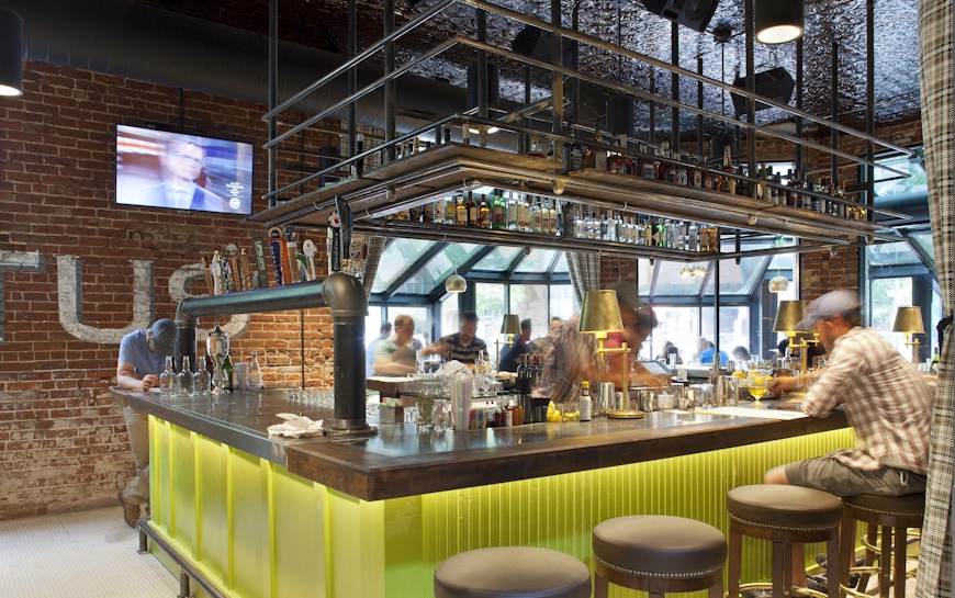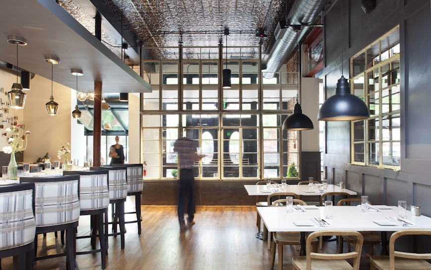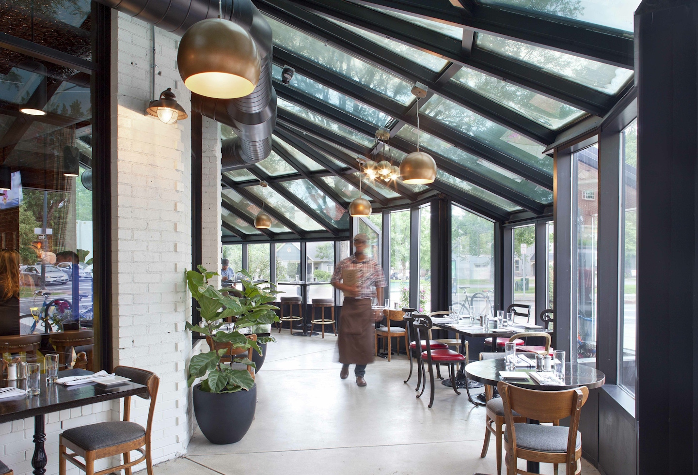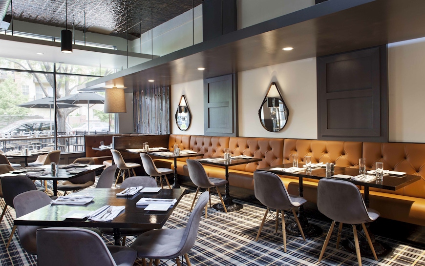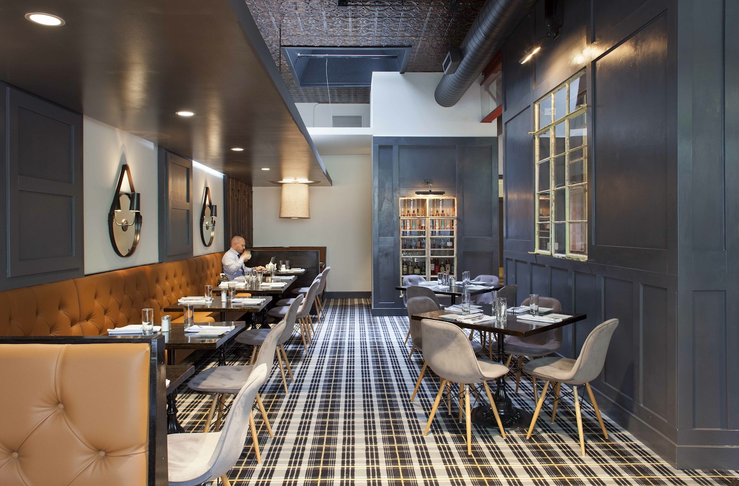 OZ’s reinvention of gastropub Argyll Whisky Beer was based on a deconstructed version of the owner’s Scottish clan crest, elements of which are found throughout the restaurant. A warm palette emphasized the renovated space’s rugged elegance. A blend of modern, industrial, Victorian, and one-of-a-kind elements take cues from the classic gastropub while creating a unique experience. Developed with the space, the Argyll brand is reflected in custom-designed graphic wall coverings, a logo branded into the entry floor, and menus. Skylights capture light during the daytime, and glass defines the space without visual obstruction. During evening hours, decorative lights cast a warm glow, shifting the space from bright to intimate. The flexible space plan is organized to delineate several separate areas with different seating options that can be arranged depending on use. A whiskey library, community/chef’s table, atrium, bar, and two outdoor spaces complete the Argyll experience.