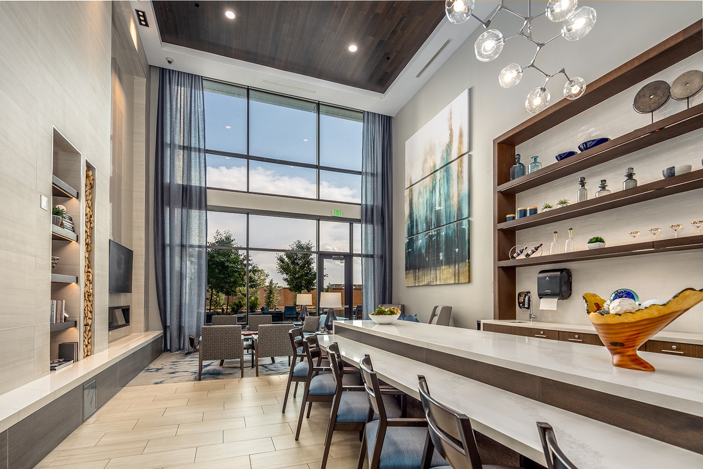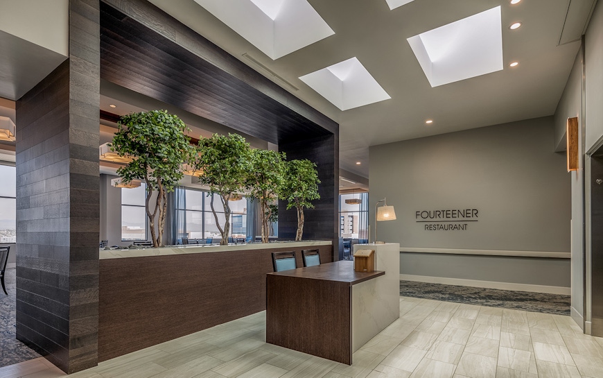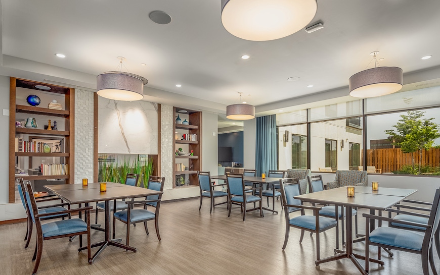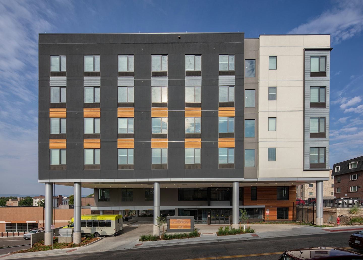 Atria was designed with the active senior in mind; and provides a variety of activities for the residents, while also considering their comfort, security and dignity. By blending modern sensibilities with the practical needs of an aging community, Atria Englewood is helping usher in the new era of senior residential design. The six-story building is conveniently located between the Swedish Medical Center and I-285, with easy access to pharmacy and post-acute rehabilitation services. The building features an underground parking garage, two private courtyards, and several on-site amenities including a café, club room, salon, fitness center, activity kitchen, and library. One of the highlights of the project is the sixth-floor dining room which has unobstructed, panoramic views of the mountains.