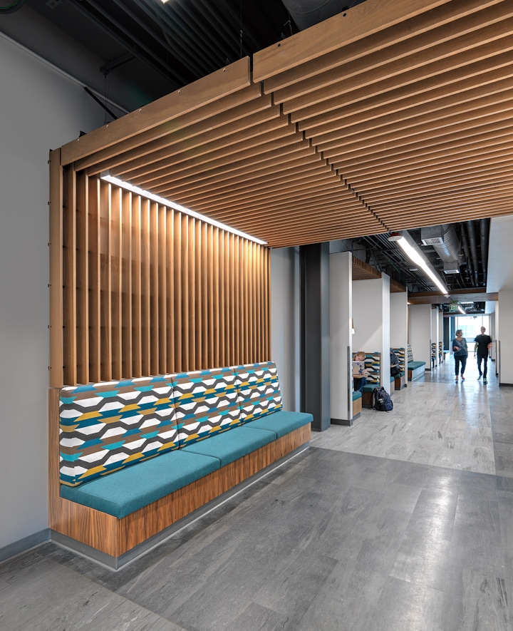 The facility includes numerous sustainable design elements to reduce its environmental footprint. To balance the flow and aesthetic of the building with sustainable design, OZ incorporated rain gardens and other stormwater features that filter out pollutants and increase filtration across the facility. Low-flow plumbing fixtures were installed to decrease water use by 40%, and the 75kW solar photovoltaic array provides renewable energy to offset 43% of the total building energy cost. LED lighting, a high-performance building envelope, and the VAV system tied to the campus that provides chilled water and steam have all contributed to a reduced energy consumption of 44.1% (over an ASHRAE 90.1 2010 baseline). The parking garages include eight publicly accessible EV charging spaces on the ground floor.