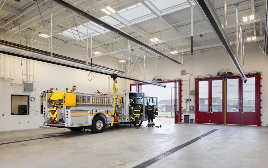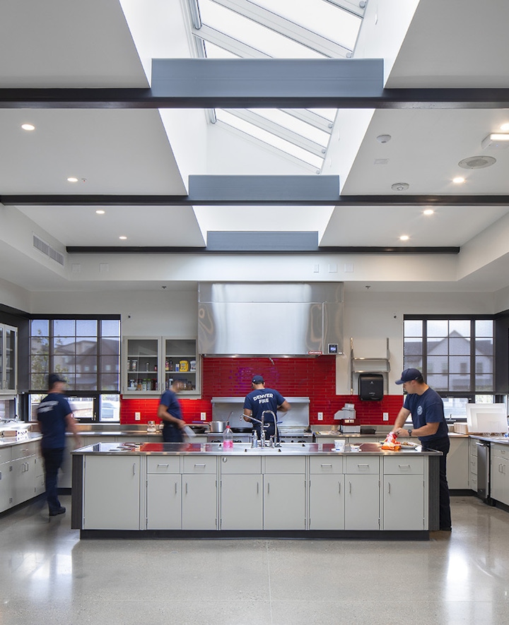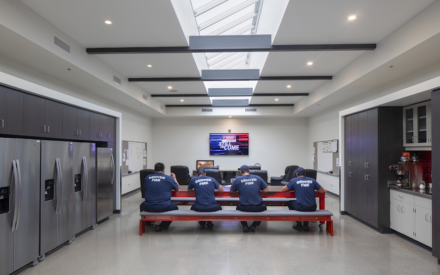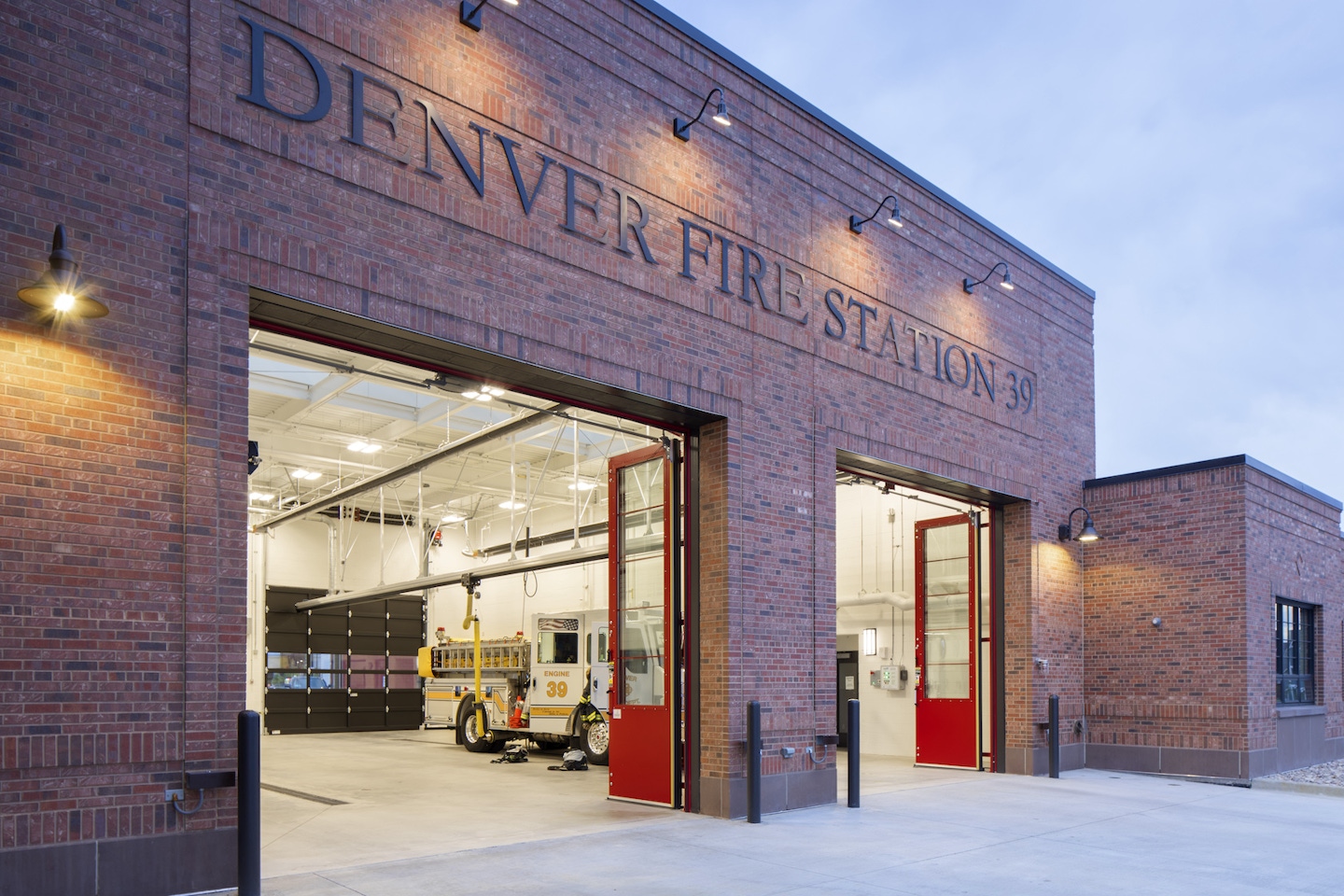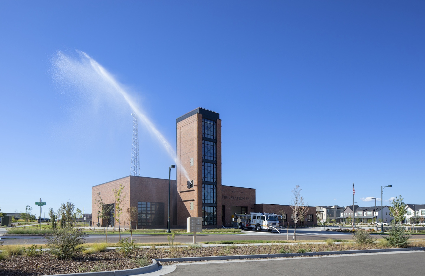 Denver Northfield Fire Station No. 39 was built in response to the growing Northfield community in Central Park, a mixed-use community built on a former airport site. As an integral part of the community, the station serves many functions—as the first responders’ workplace and home, a place for apparatus storage and repair, and a good neighbor within the community structure. The station is LEED Gold certified, and the overall design balances functionality with sustainability for this important public facility. Traditional exterior design and materials were used to continue the strong image of DFD, with careful planning and detailing of the interior for a light-filled living area with access to the apparatus bay at all times. As a public building, operations and maintenance are key to this 50/100-year building, including sustainable design. For overall energy-use reduction, OZ incorporated high-performance glazing and efficient lighting and mechanical systems. Healthy building materials and ample daylight through vertical glazing and skylights, a fitness center, and occupant controls were all implemented to support the comfort and health of the firefighters. Water-conserving toilets, faucets, and showers results in a 46% water use reduction as well.