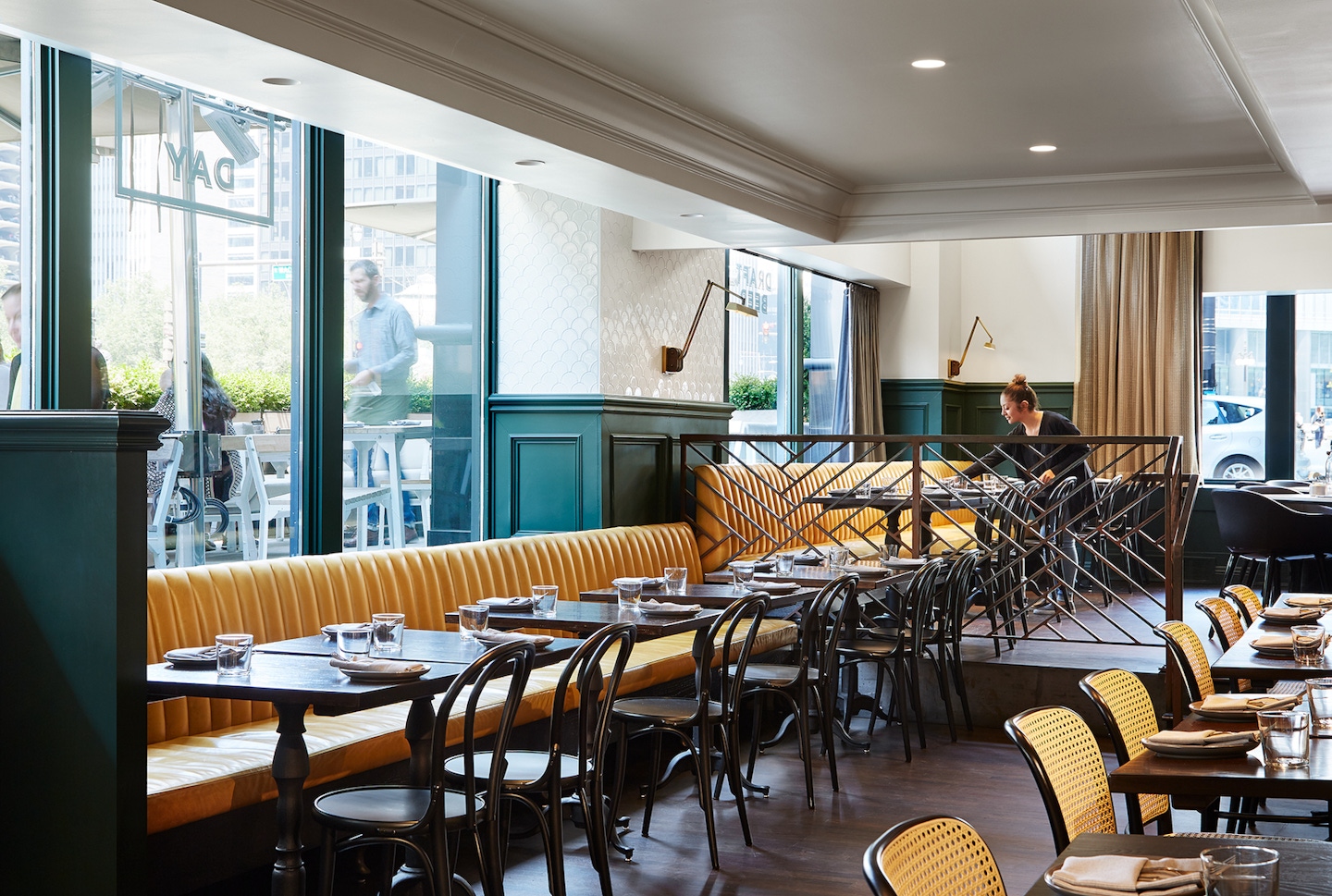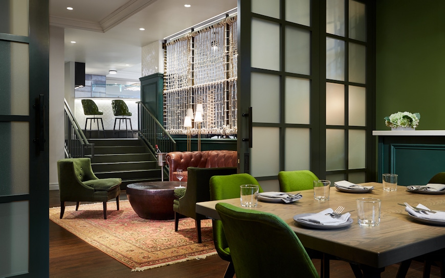 Located within Kimpton’s Hotel Monaco, Fisk & Co., is a mussel and beer restaurant with a rich and classic look paired with unexpected nautical motifs. OZ deconstructed both the history of the space to develop the brand identity and design drivers. The name derives from the history of the building, once the home of the D.B. Fisk & Co. hat factory in the 1920’s. Using mussels as inspiration, the color pallet consists of rich greens, slate blue, dark brown, and pops of yellow both within the space and throughout the marketing materials. For an a-typical nautical experience, a hand-crafted rope art installation serves as a partition between rooms and a chandelier made of clear bottles makes a play on the “message in a bottle”.