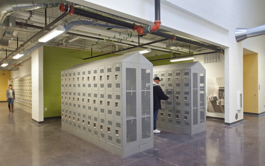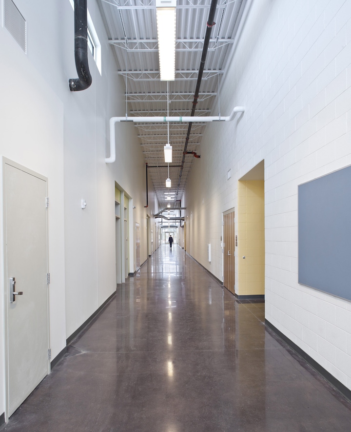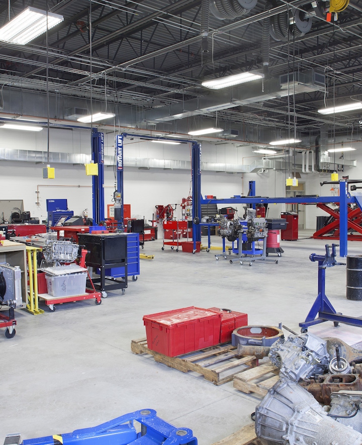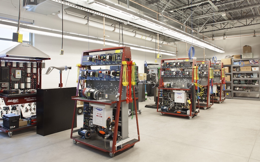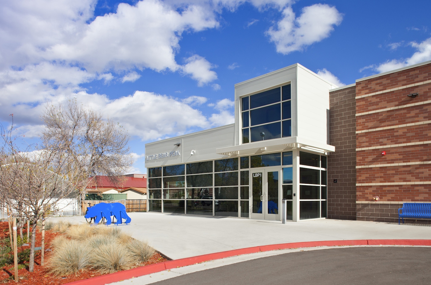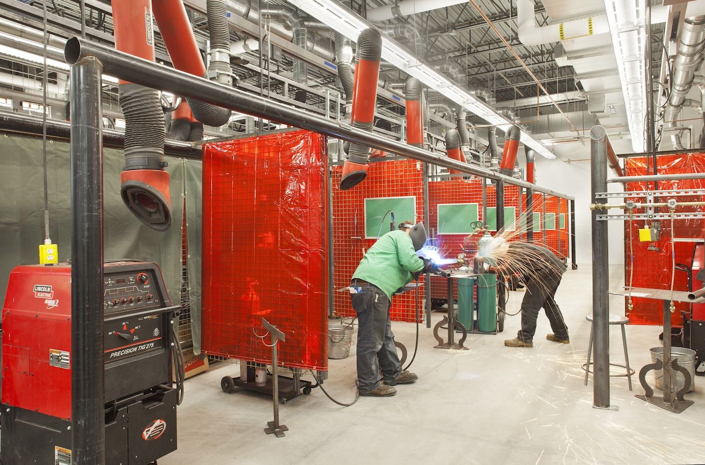The Little Bear Peak building was designed to house lab space for fabrication and testing, and was the first in a series of buildings that OZ master planned and designed for the Larimer campus The electronics lab provides space for students to learn about clean energy technology, such as photovoltaics, and jthe fabrication lab supports welding and other metal fabrication processes. An engines lab was included in the automotive shop for the disassembly, modification and testing of engine components.