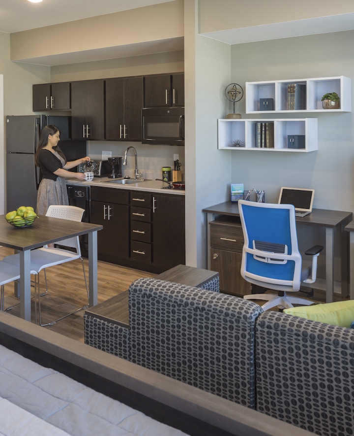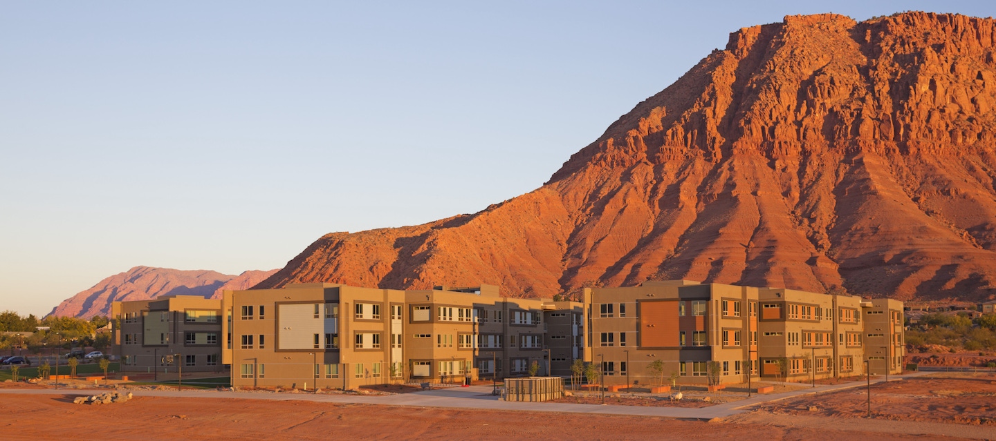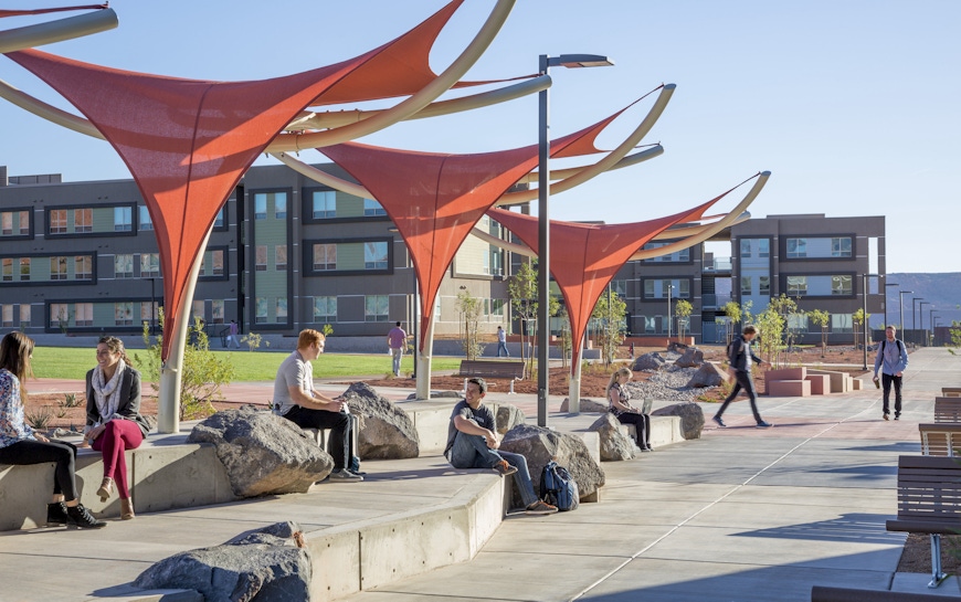Rocky Vista University’s housing corridor, thoughtfully sited just off the main quadrangle, creates a 24/7 work-live community. The building’s slight rotation from the North/South grid carves out pockets of green space between buildings and provides breathtaking views of Big Red Mountain beyond the site. Social quads and lawns fill the intermediate spaces between the school and residences to better ensure connectivity between in-residence and commuting students. The plan for a future retail center at the southeast corner will bring the main street to the site, improving access to amenities for students and Ivins community members.