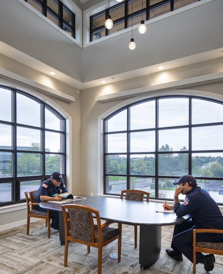 OZ architecture designed a new fire station to meet the current and future needs of the fire department and the quickly growing community with goals to improve site circulation and crew response. Due to the restricted site size, the design solution called for a two-story building with partial basement, reducing the footprint while providing the needed firefighter living quarters. The design also allowed the building to be placed within the required setbacks while providing ample site circulation, open space, and landscaping. The aesthetic goal was to achieve a civic and traditional structure which visually relates to the recently constructed Station No. 31, also designed by OZ Architecture. Due to the proximity of these two stations, creating a visually related station design was the start to achieving a district identity.
