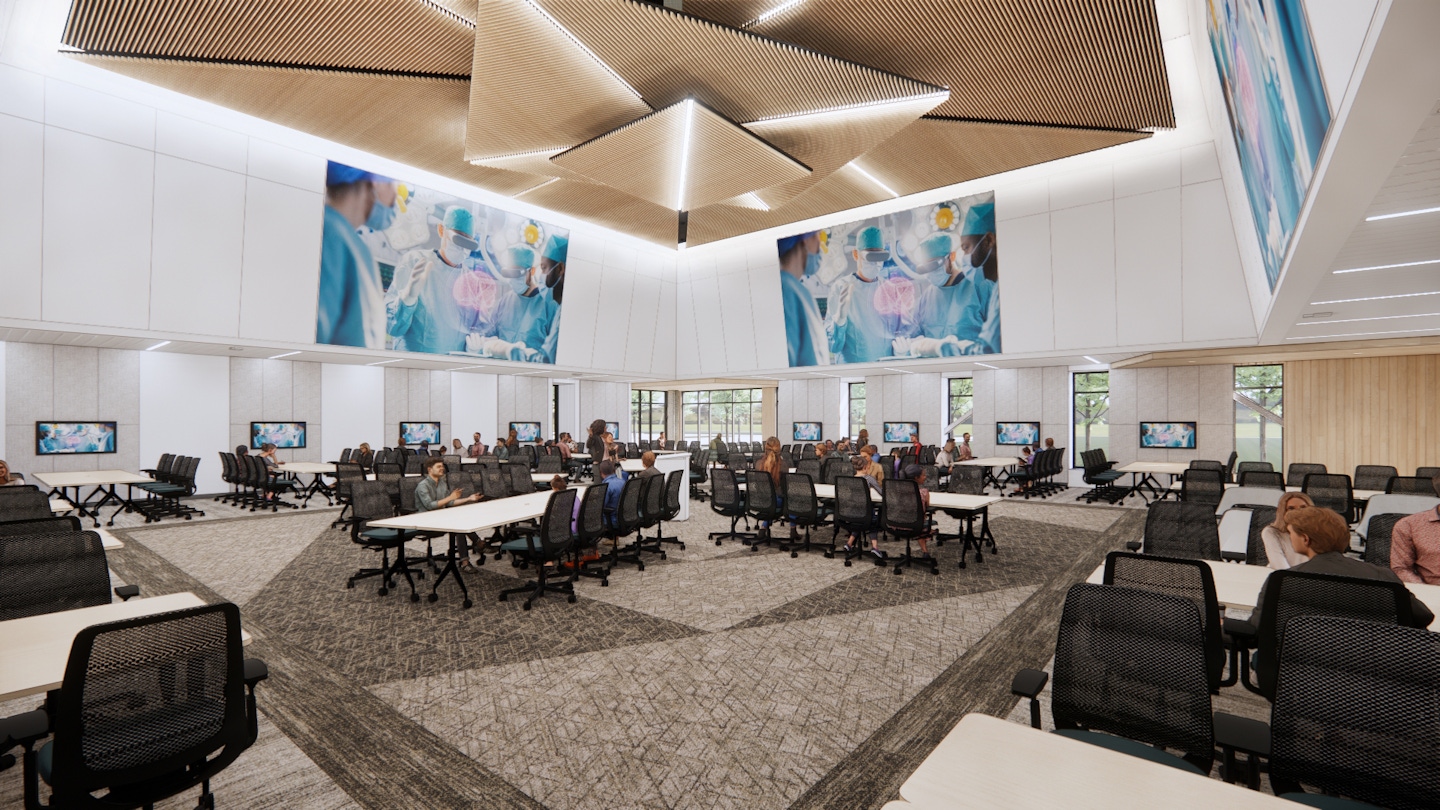 The first step was looking at the lifestyle and demands of the students, faculty and staff that would be using the building. Medical students have constant demands and grueling schedules, so we thoughtfully designed the distribution and flow of spaces so that students would never be far from the resources they needed to support their mental and physical health. A variety of study, social, play and focus spaces are dispersed throughout the building between the classroom and lab spaces.
