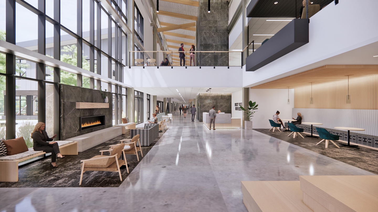 When it came to the structure of the building, here again, we took cues from the idea of mind/body connection. The building itself became a metaphor for the body, and we sought to celebrate that by exposing much of building’s own ‘skeleton’. The north and east sides of the building are more protected, with more building skin and less glazing. As you move to the center spine, the building opens to a double-volume space with exposed columns, cross-bracing, wood glulams and large expanses of glazing, which look out to the landscaped quad on the exterior.