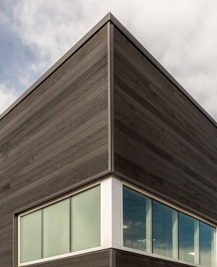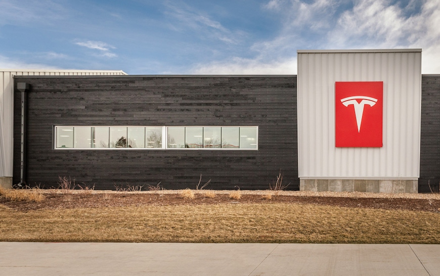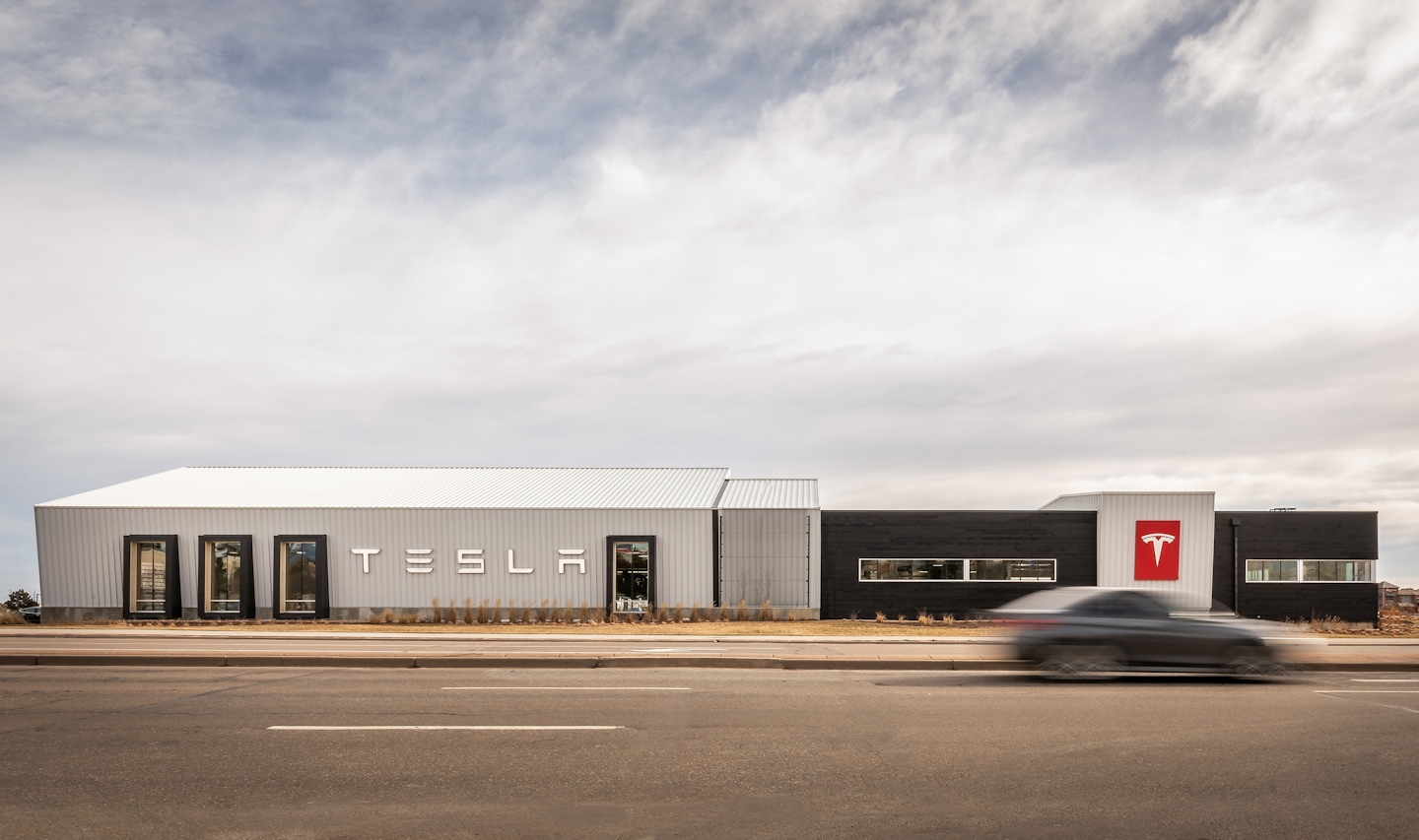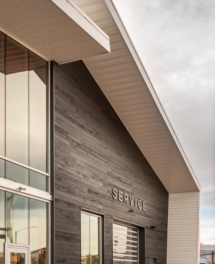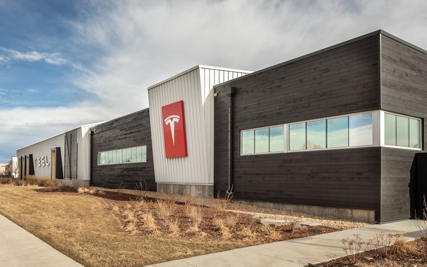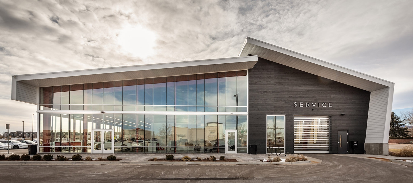 Placed at a highly visible corner opposite the town hall of Superior, CO, OZ was challenged with making a metal building an attractive and modern showroom for the iconic brand. Using the economies of the pre-engineered building, the shape, size, and structure were kept simple. Like the product itself, the building is a combination of traditional and modern influences. The asymmetric gabled façade reflects local vernacular traditions, while the buildings material palette reflects modern influences. Playing on TESLA’s own color preferences, the skin is a combination of stark white metal, charcoal shou sugi ban wood siding, and glass, all of which sit atop a bright red structural frame. The corner facing a major crossroad was opened up through a glazed “front porch” and accented roof line creating a dynamic play between two overlapping planes in lieu of a standard gable roof. The building design was well received by the citizens overcoming any earlier skepticism of a metal box at the town’s entrance.