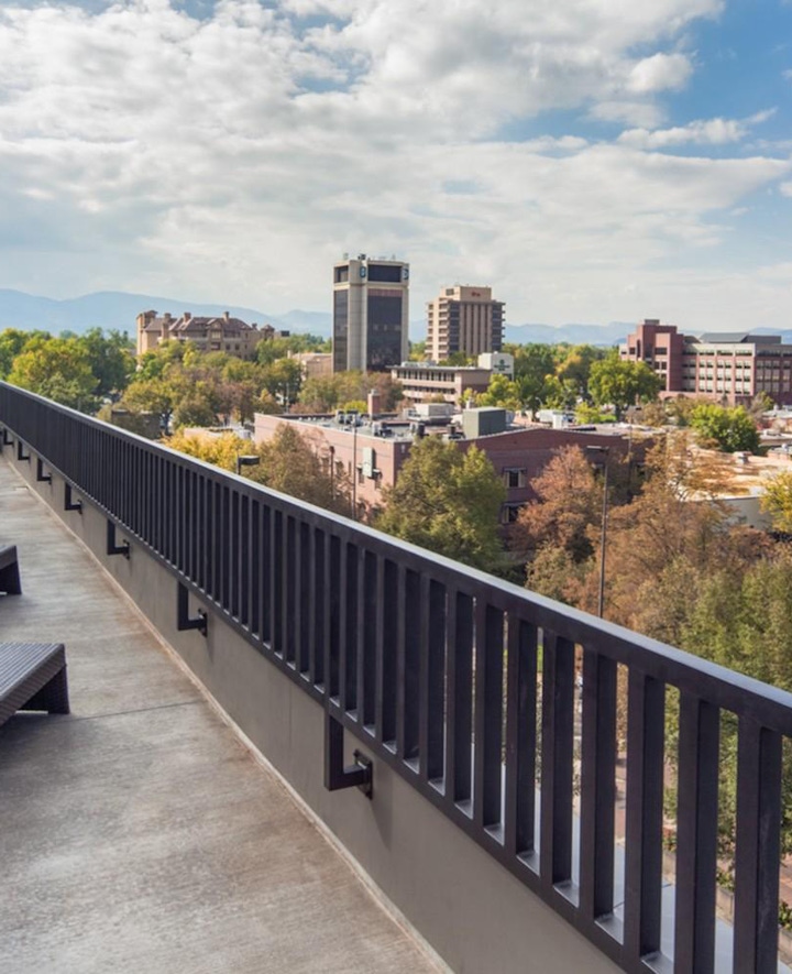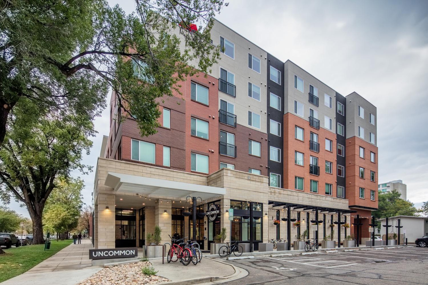 Uncommon was designed to relate to the historic urban neighborhood through its massing and proportion and the careful selection of materials. The mixed-use building creates a dynamic streetscape, blending a strong retail presence with the already lively area of town. Aligned with Fort Collins’ notoriously active alleyways, Uncommon is designed with a “Paseo” on the south end of the site to connect to the illuminated circuit of alleys found in the area. Residents enjoy a private gathering space in this corridor, steps away from bustling College Avenue. The upper floors of Uncommon are dedicated to 120 student residential units for the college town of Fort Collins. Multiple windows are incorporated in each floorplan for ventilation and to maximize natural light, and several floorplans provide private terraces ideal for Colorado’s many days of sunshine. Featured amenities include a fitness room, two outdoor courtyards, a lounge, and a business center. The complex also offers outdoor grills and a bike room for residents.