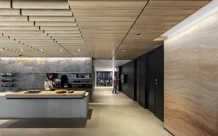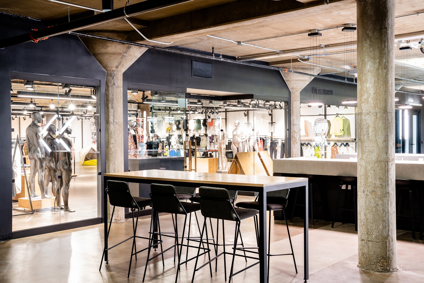 The design prioritized reflecting the brand's essence in showrooms and the lobby while maintaining rigorous testing standards in the lab spaces. The design team creatively integrated the building's industrial origins, leveraging its thick concrete slabs and large column capitals to craft a distinctive aesthetic, exemplified by the main hall designed to represent a canyon, resonating with the outdoor brands in VF’s portfolio. We strategically placed certain functions in the building's basement. To combat challenging lighting conditions in the basement, we brought natural light into the center core of the building by cutting large openings between the first level and basement level under the building’s large existing skylights. The project was completed in collaboration with RAPT Studio.